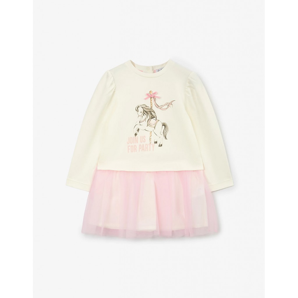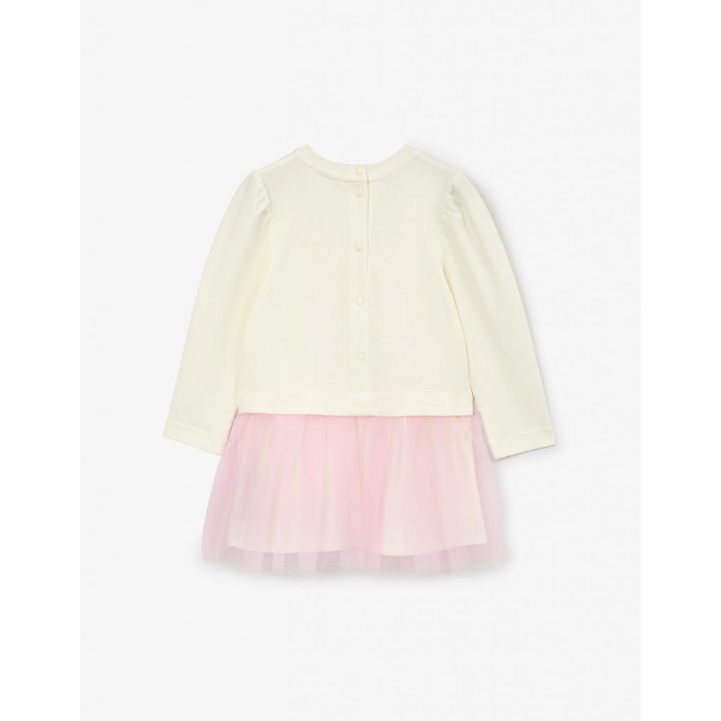 Белое платье с длинным рукавом — стильный комфортный вариант для аутфитов малышки в период прохладного межсезонья. Платье выполнено из мягкого пластичного хлопкового интерлока. Рукава-фонарики и отрезная юбка с воздушной розовой сеткой, создающей цветовой и фактурный контраст, делают платье нарядным, подчеркивающих красоту и нежность образа девочки. В оформлении модели используется оригинальный принт. Платье застегивается на кнопки на спинке.