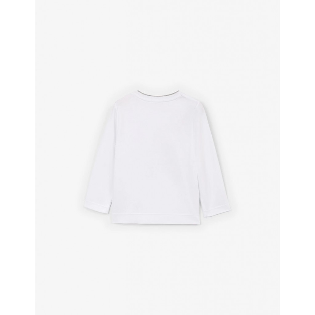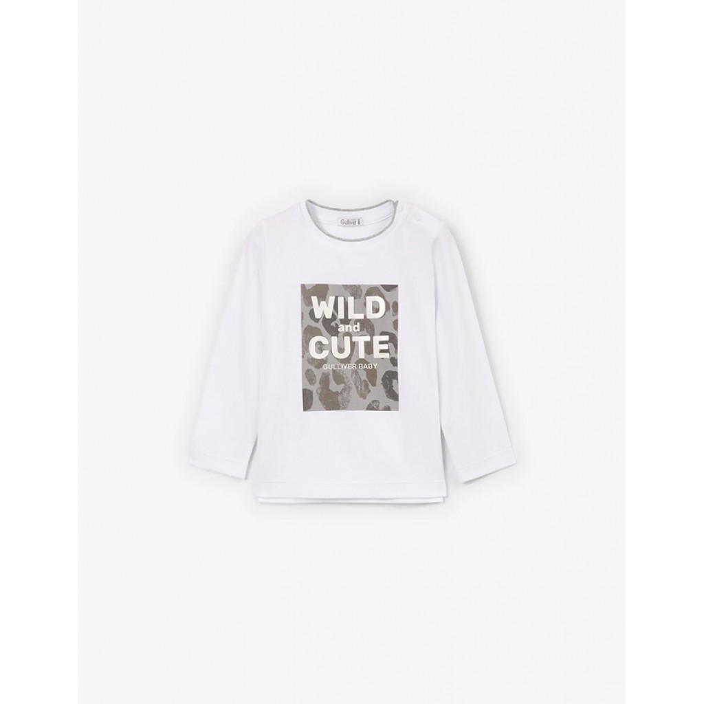 Белый лонгслив, выполненный из мягкого хлопкового интерлока, - прекрасный повседневный вариант. Мягкая свободная форма и пластичный дышащий трикотаж обеспечивают комфорт и свободу движений. Модный анималистичный рисунок придает образам с лонгсливом остроту современных трендов, делая малыша настоящим стилягой. Застежка на кнопки в плечевом шве способствует удобной эксплуатации, необходимой маленькому ребенку. В оформлении модели использован шрифтовой принт.