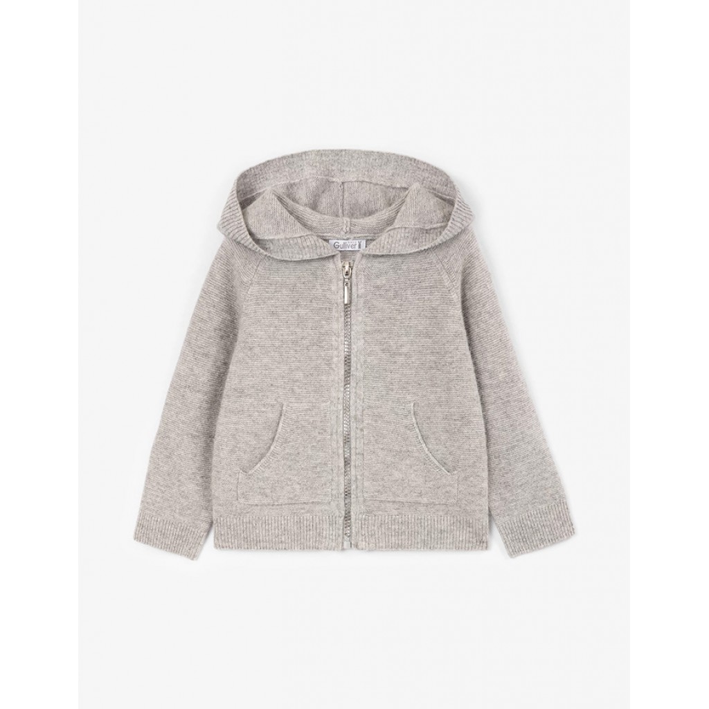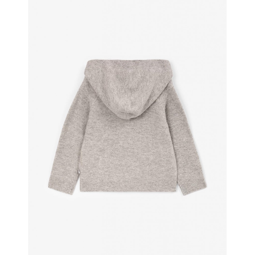 Серый вязаный кардиган с капюшоном станет неотъемлемой частью комфортных осенне-зимних образов мальчика. Смесовая пряжа с высоким содержанием шерсти мериноса и ангоры придает кардигану особую нежность, пушистость, уют. Рукава-реглан создают мягкую форму, очень комфортную для маленького ребенка. Кардиган застегивается на пластиковую молнию, имеет удобные карманы-кенгуру.