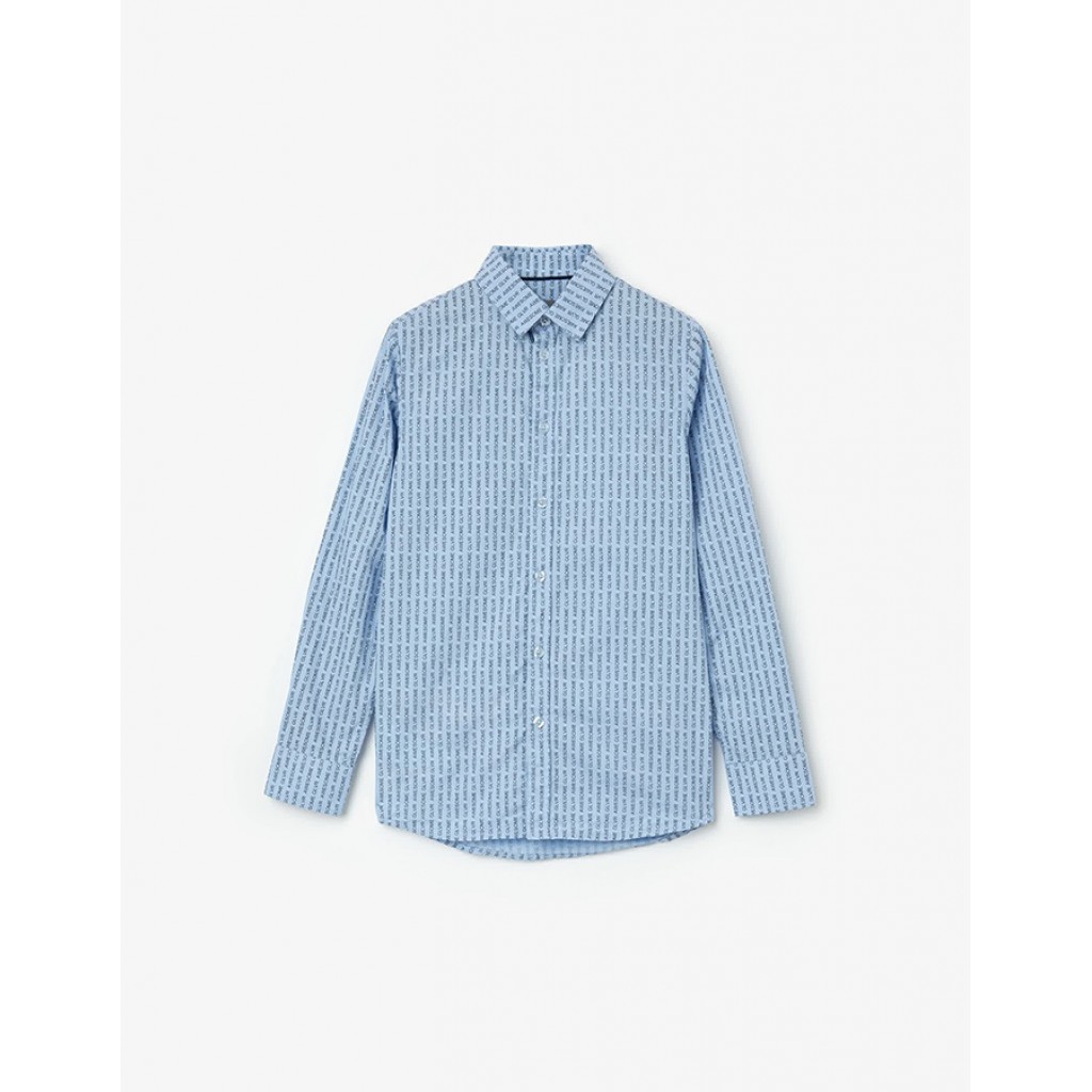 Голубая сорочка с длинным рукавом прямого силуэта - стильный и практичный повседневный вариант. Дизайн модели построен на контрасте мелкого повторяющегося шрифтового рисунка ткани и однотонной планки. В нижней части планки расположен шрифтовой декор.