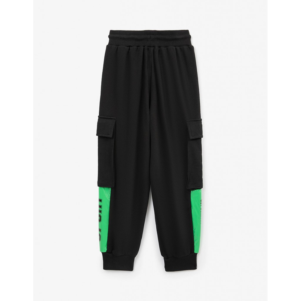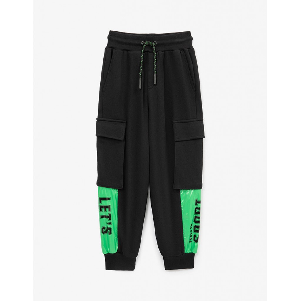 Черные брюки-джоггеры из футера с карманами-карго идеально подойдут для активных осенних прогулок! Дизайн модели, построенный на яркой контрастной отделке - цветных вставках с шрифтовыми принтами, придает брюкам остроту и динамику спортивного стиля. Пояс на резинке с кордами обеспечивает отличную посадку. Карманы со скосками, дополняющие карго, делают эксплуатацию изделия очень удобной.