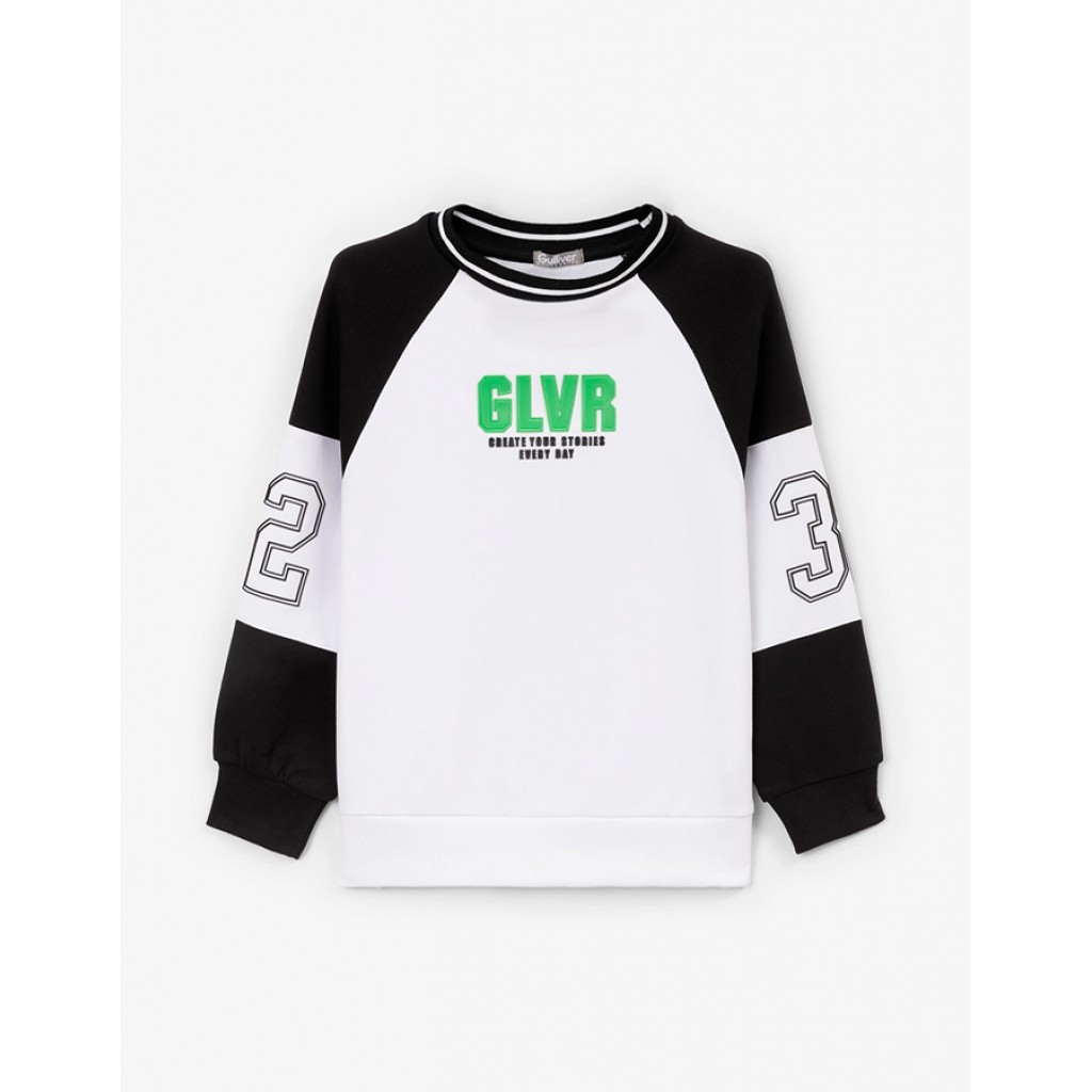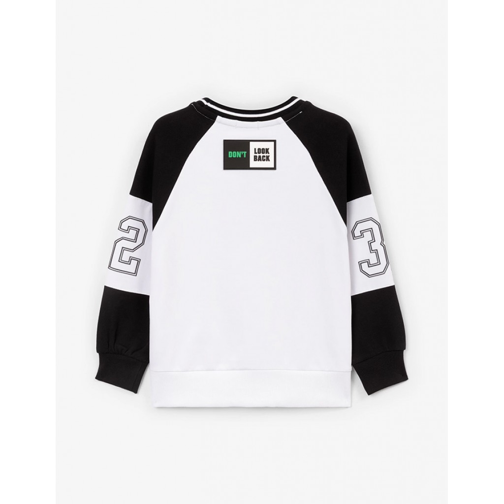 Белый свитшот силуэта умеренный оверсайз – яркий трендовый элемент гардероба мальчика. Свитшот с рукавами-реглан выполнен из мягкого, теплого, формоустойчивого хлопкового футера с мягкой петельчатой изнанкой. Дизайн модели построен на динамичных членениях, колорблокинге и крупных шрифтовых принтах и декорах, придающих толстовке энергичный драйвовый вид.