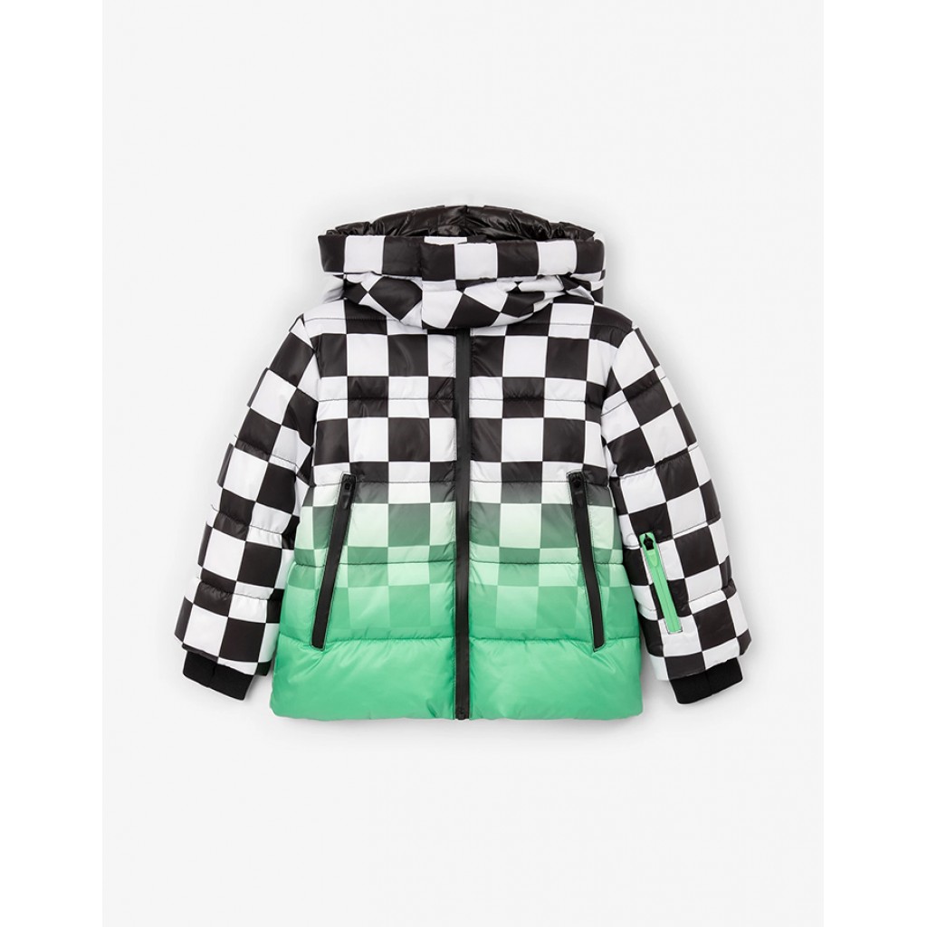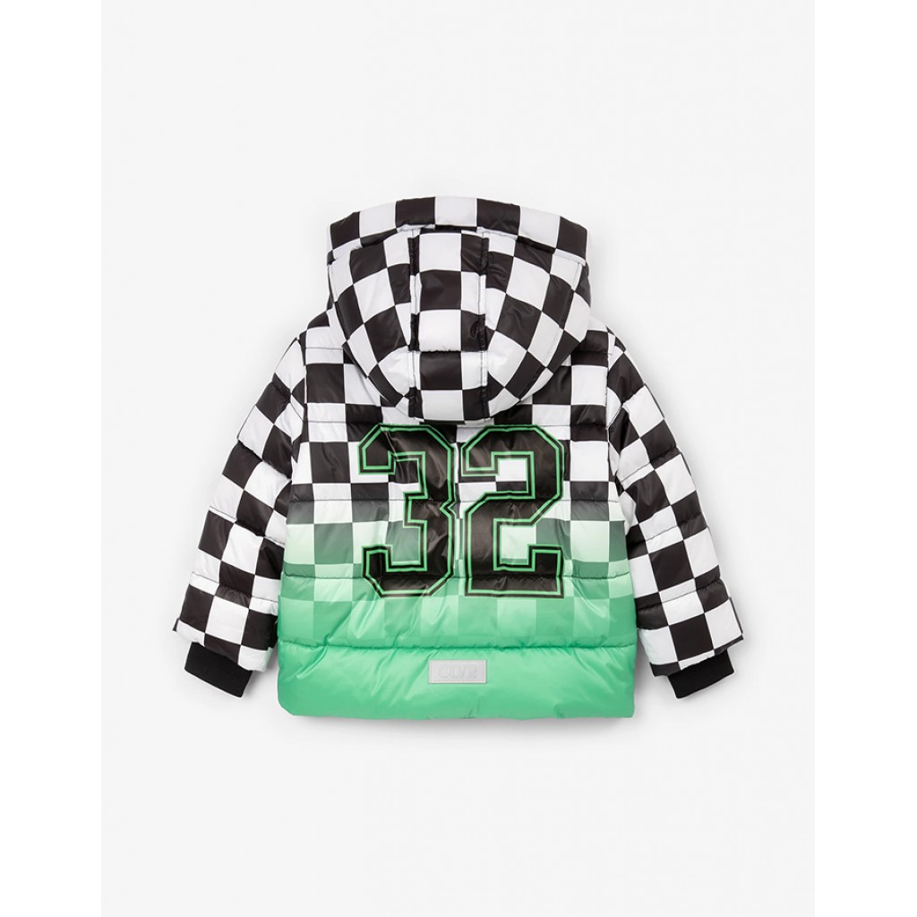 Демисезонная куртка с ярким принтом - лучший выбор для прохладного времени года! Она выглядит сочно, динамично, убедительно, повышая настроение и способствуя созданию особого вайба, мотивирующего на движение. Стеганая куртка на искусственном пуху выполнена из блестящей влагостойкой плащовки на тонкой плащевой подкладке. Дизайн модели построен на уникальном сочетании черно-белой клетки-шахматки и градиентного цветового перехода, поддержанных однотонной черной отделкой. Кроме того, куртка обладает целым рядом функциональных деталей, важных для комфортного времяпрепровождения ребенка на улице. Глубокий капюшон с внутренними утяжками, литые влагостойкие молнии на центральной застежке и карманах, карман на рукаве для ски-пасса создают удобство в эксплуатации вещи. В оформлении модели использован крупный принт с изображением цифры, усиливающий драйвовый характер модели, а также светоотражающая нашивка, способствующая безопасности мальчика в темное время суток.