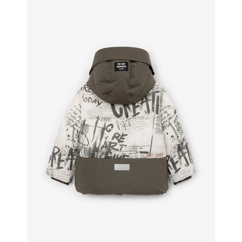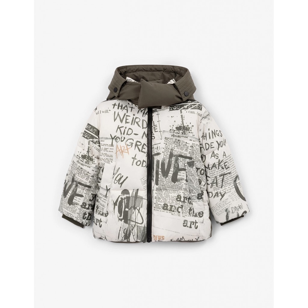 Серая зимняя куртка, выполненная из матовой влагостойкой плащовки, защитит мальчика от самых сильных морозов! Дизайн модели построен на яркой "газетной" графике, дополненной шрифтовыми изображениями, нанесенными от руки размашисто и небрежно. Отделка из однотонной плащовки, сформированная по принципу колорблокинга, уравновешивает динамичный рисунок, создает гармоничный баланс, способствует свежему восприятию вещи. Мягкая флисовая подкладка и утеплитель - искусственный пух - обеспечивают максимальный комфорт, уют и тепло. Важные функциональные детали: карманы-листочки на кнопках, съемный капюшон с длинным козырьком, утяжки по капюшону и низу изделия, мягкие рибовые манжеты, внутренние лямки, позволяющие в помещении носить куртку за спинкой как рюкзак, создают необходимое удобство в эксплуатации вещи. Куртка застёгивается на тракторную молнию с внутренней ветрозащитной планкой, исключающей травмирование подбородка. В оформлении модели использованы нашивка на капюшоне и светоотражающий патч, способствующий безопасности мальчика в темное время суток.