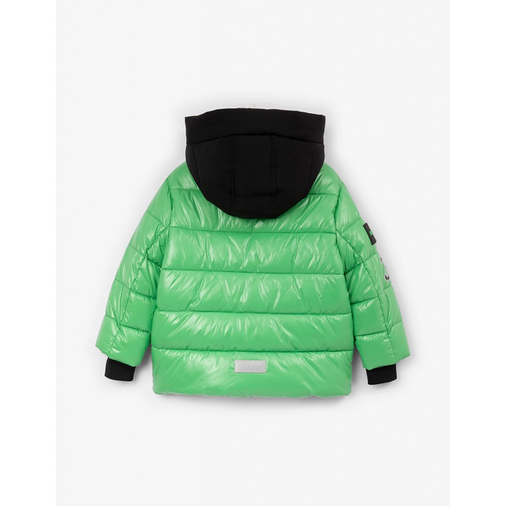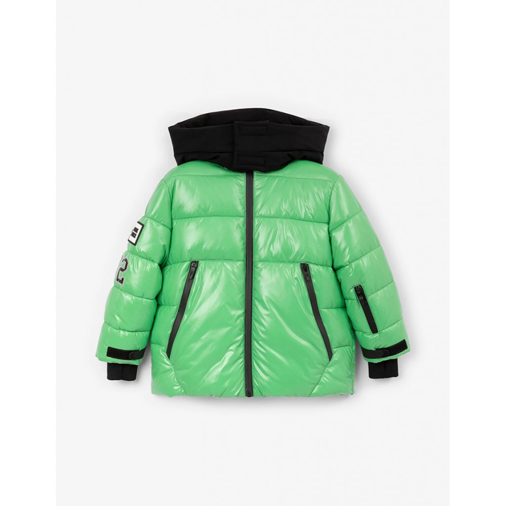 Стеганая зимняя куртка насыщенного зеленого цвета — яркий акцент зимнего образа! Куртка на искусственном пуху выполнена из влагостойкой плащовки с модным мокрым блеском на мягкой флисовой подкладке, что делает ее практичной, износостойкой, способной показать себя с лучшей стороны в суровых зимних условиях. Дизайн модели построен на ярких приметах спортивного стиля. Колорблокинг, сочетание фактур, контрастные детали и фурнитура превращают базовую по форме куртку в интересную небанальную вещь, мотивирующую на движение! Кроме того, она обладает целым рядом функциональных элементов, необходимых для комфортного времяпрепровождения ребенка на улице, в том числе, во время занятий активными видами спорта. Глубокий капюшон с внутренними утяжками и высокой стойкой, фиксирующейся на велкро, рибовые манжеты с щелями для больших пальцев, паты на липучках по рукавам, внутренняя утяжка по низу куртки, влагостойкие литые молнии на центральной застежке и карманах усиливают защитные свойства изделия. Куртка для мальчика оснащена внутренними лямками, позволяющими в помещении носить ее за спиной как рюкзак, оставляя руки свободными. На рукавах куртки расположены лаконичный шрифтовой принт и минималистичная резиновая нашивка, а также карман на молнии для ски-пасса, поддерживающие энергичный вайб модели. Светоотражающая нашивка на спинке способствует безопасности мальчика в темное время суток.