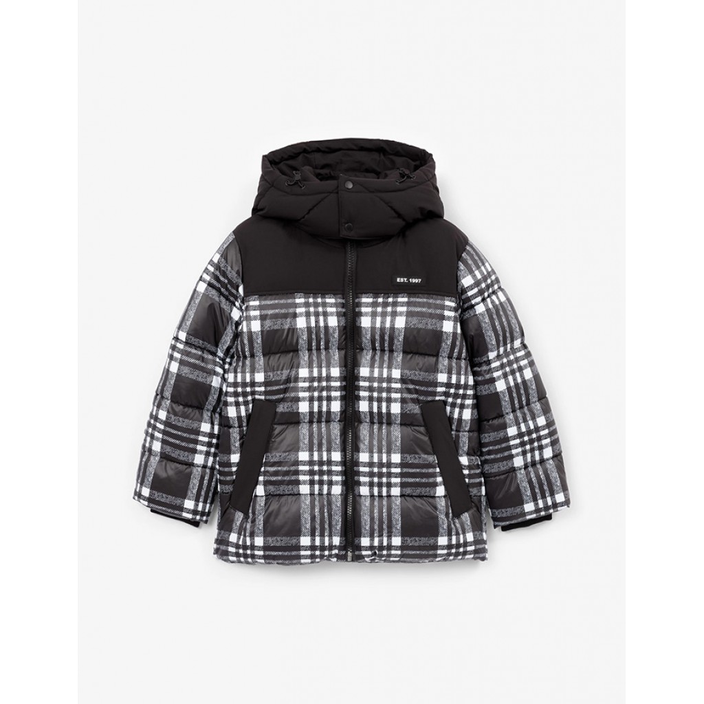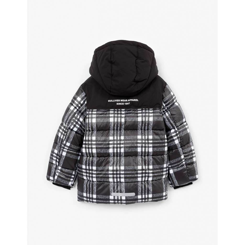 Черная куртка в клетку - лучший выбор стильной практичной вещи для холодного времени года! Дизайн модели построен на сочетании фактур однотонной и орнаментальной плащовок. Плотная черная плащовка на кокетках и капюшоне и плащовка в клетку создают гармоничное взаимодействие, делают куртку интересной, брутальной, динамичной. Глубокий съемный капюшон, подкладка из мягкого уютного флиса, вместительные карманы-листочки на молниях, внутренние лямки, позволяющие в помещении носить куртку за спиной как рюкзак, - все продумано для удобства и комфорта мальчика на прогулке. Куртка застегивается на тракторную молнию с ветрозащитной планкой. На спинке изделия размещена светоотражающая нашивка, способствующая безопасности подростка в темное время суток.