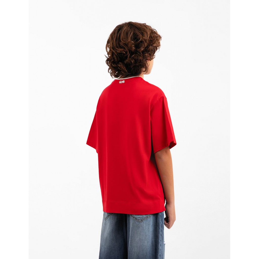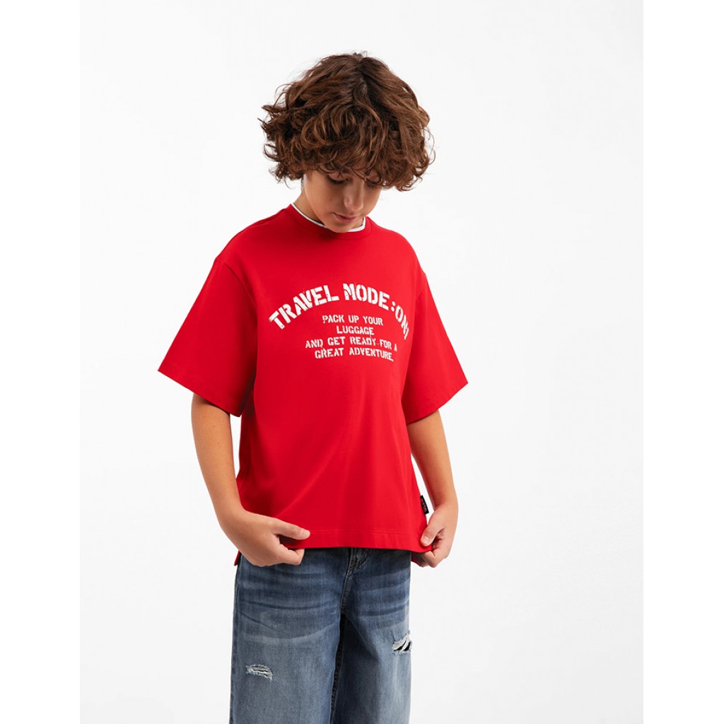 Яркая футболка с коротким рукавом - основа летнего гардероба мальчика! Дизайн модели построен на имитации многослойности. Двойная горловина с белым кантом производит впечатление двух изделий в одном, придавая базовой по форме вещи индивидуальность. Шрифтовой принт поддерживает цветовой контраст, делает футболку острой, модной, современной, прекрасно вписывающейся в динамичные летние образы подростка. Мягкий хлопковый трикотаж, силуэт умеренный оверсайз, спущенная линия плеч, небольшие разрезы в боковых швах создают удобство, свободу движений, необходимые для комфортной эксплуатации вещи.