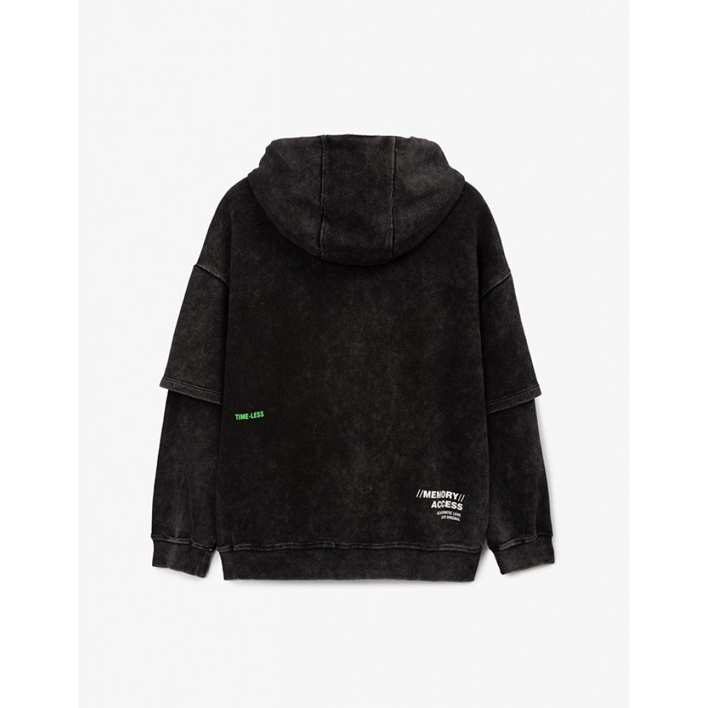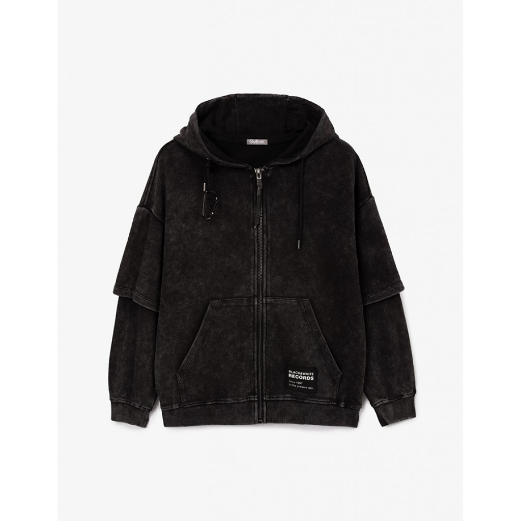 Распашная толстовка из футера с мягкой петельчатой изнанкой - основа весеннего гардероба в спортивном стиле! Выполненная из тонкого мягкого хлопкового футера, объемная толстовка модного и практичного серого цвета имеет классный вареный эффект, иллюстрирующий модную винтажность. Высокая плотность и прекрасное качество трикотажного полотна делают толстовку добротной, износостойкой, прекрасно держащей форму. Акцент на рукавах, имитирующих многослойность, добавляет образу небрежность и непринужденность, вовлекающие в расслабленный подростковый вайб. Толстовка имеет глубокий капюшон на тонкой трикотажной подкладке с кордами, один из которых заканчивается стильным черным карабином. Карманы-кенгуру способствуют удобной эксплуатации. Толстовка застегивается на металлическую молнию с силиконовой тесьмой. В оформлении модели использованы лаконичный шрифтовый принт и текстильная нашивка.