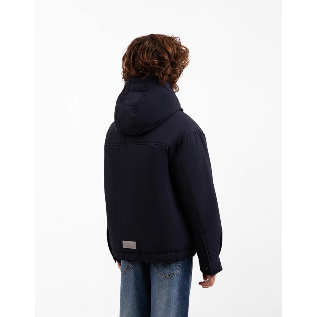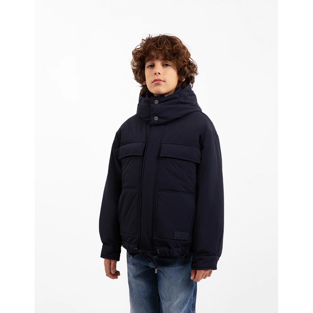 Утепленная куртка с капюшоном обеспечит комфортный переход от зимы к лету, сделав гардероб межсезонья удобным, практичным, функциональным. Синяя куртка из матовой влагостойкой плащовки на синтепоне - прекрасный вариант куртки для мальчика, в которой найден оптимальный баланс стиля, комфорта, качества. Интересный дизайн с четырьмя объединенными карманами, два из которых - с клапанами на потайных кнопках - расположены на верхней части полочек, а два - с боковыми входами - внизу, делает куртку стильной, лаконичной, очень удобной в эксплуатации. Стеганая с утеплителем подкладка способствует сохранению стабильной формы изделия. Стеганая внутренняя ветрозащитная планка и внешняя планка, фиксирующаяся на потайные кнопки, делают куртку неуязвимой для капризов погоды. Куртка имеет неотстегивающийся капюшон с высокой стойкой, застегивается на металлическую молнию с акцентным ярким пуллером. Манжеты, подобные рубашечным, придают модели современный вид, подчеркивая гармоничный союз кэжуальных и спортивных элементов в одном изделии. Куртка имеет утяжку из шнура с металлическими наконечниками по низу изделия. Вся металлическая фурнитура выполнена в цвете темный никель. На спинке расположена светоотражающая нашивка, способствующая безопасности мальчика в темное время суток.