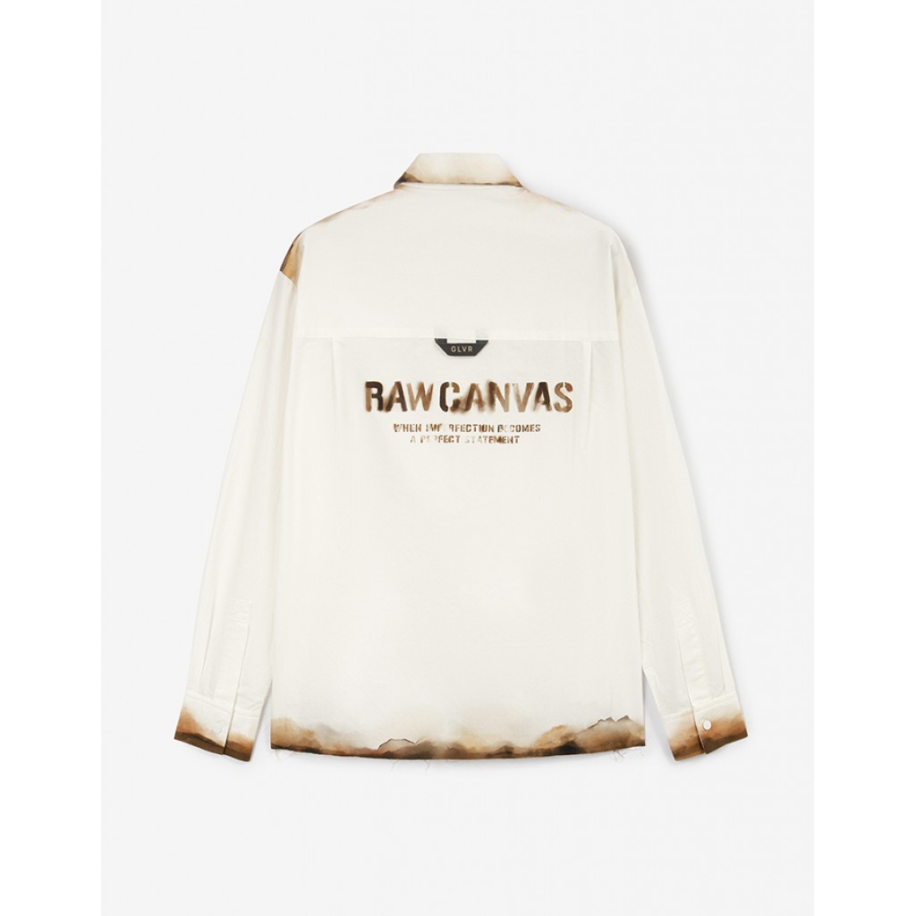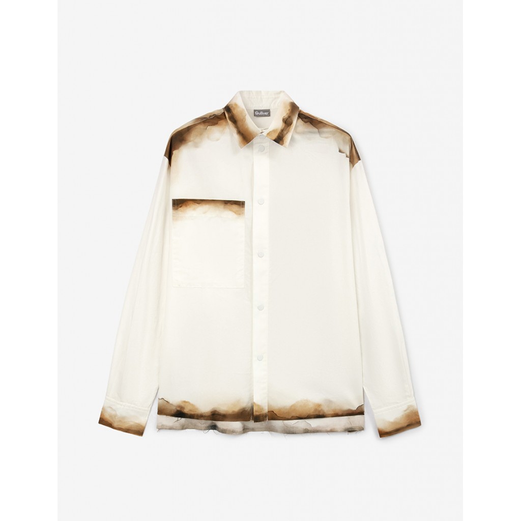 Стильная рубашка - неотъемлемый атрибут весеннего гардероба мальчика. Дизайн модели, построенный на оригинальном акварельном принте на деталях: воротнике, манжетах, кармане, плечевых швах, по низу изделия, напоминающем следы патины, придает модели уникальность. Открытый срез по нижнему краю и размытый шрифтовой принт на спинке усиливает модный винтажный вайб, делает рубашку острой, модной, концептуальной. Рубашка имеет прямую свободную форму с разрезами в боковых швах, застегивается на кнопки. В оформлении модели использована тесьма-петля с силиконовым шрифтовым декором.