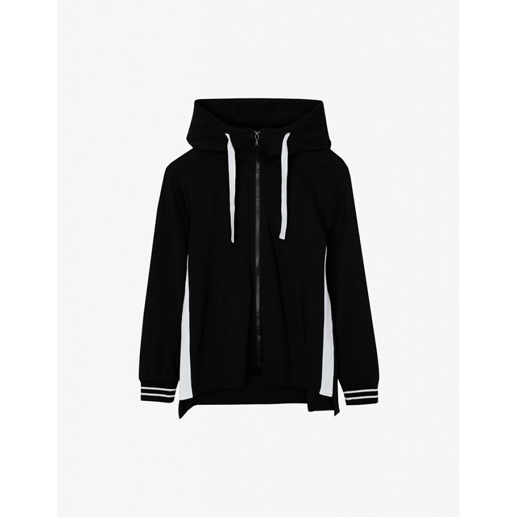 Черная распашная толстовка из футера отлично дополнит спортивный комплект во время занятий физкультурой на улице или в прохладном зале. Современный дизайн с контрастными вставками и удобная комфортная форма делают толстовку хорошим функциональным приобретением в преддверии учебного года.