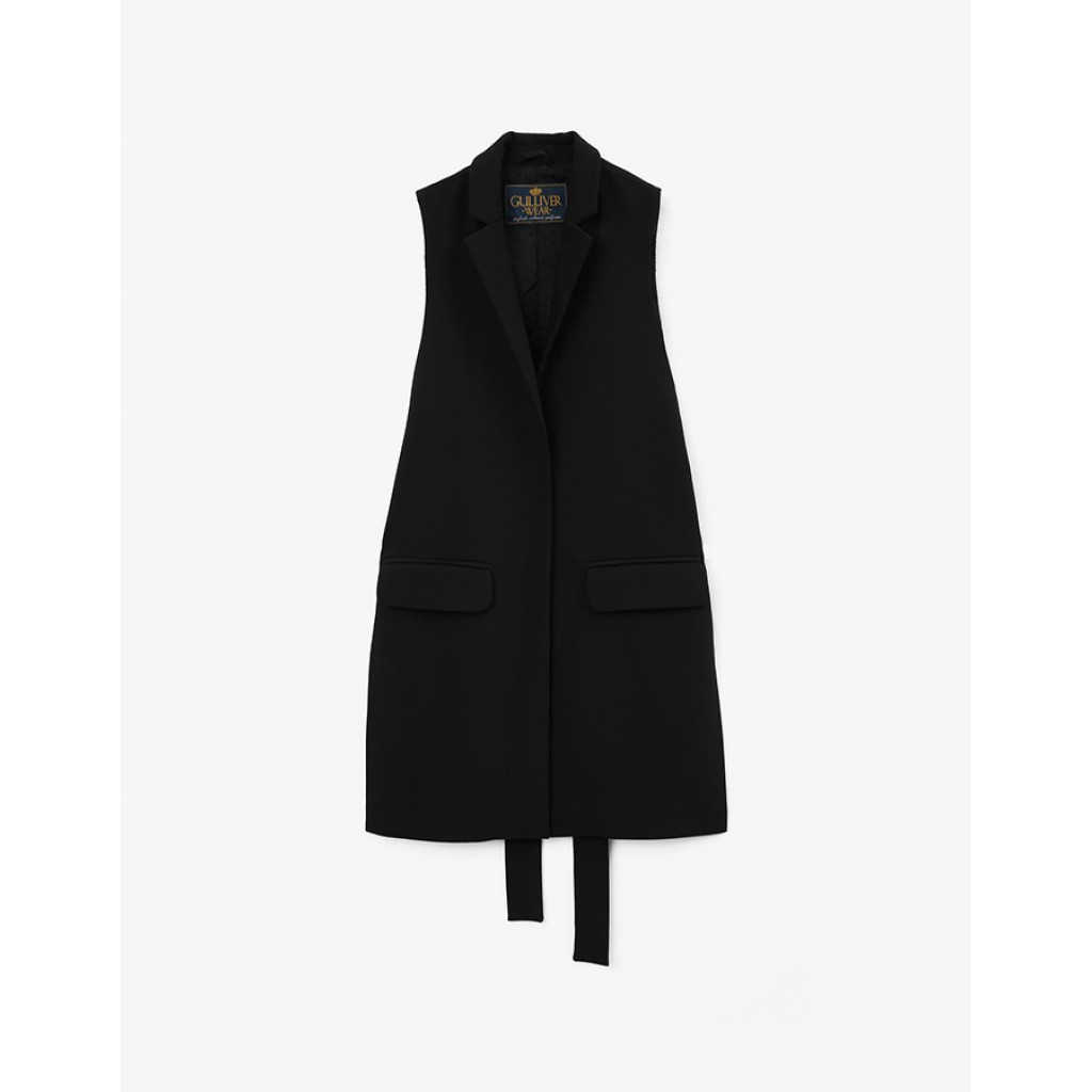 Черный текстильный жилет - яркая, острая, экстравагантная вещь, созданная в полном соответствии с деловым дресс-кодом. Интересный дизайн модели построен на резком контрасте длины переда и спинки. В сочетании с белой блузкой, водолазкой, рубашкой, жилет красиво контрастирует с ними по фактуре и цвету, акцентируя внимание на модных современных пропорциях в образе девочки. Необычное дизайнерское решение усилено поясом, который можно завязать на небрежный узел или бант. Строгий, лаконичный, элегантный, жилет подчеркнет яркую индивидуальность девочки и надолго закрепит за ней имидж иконы стиля.