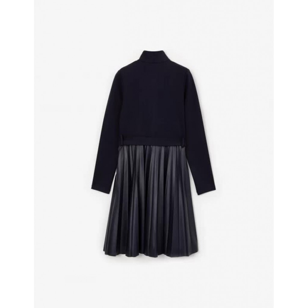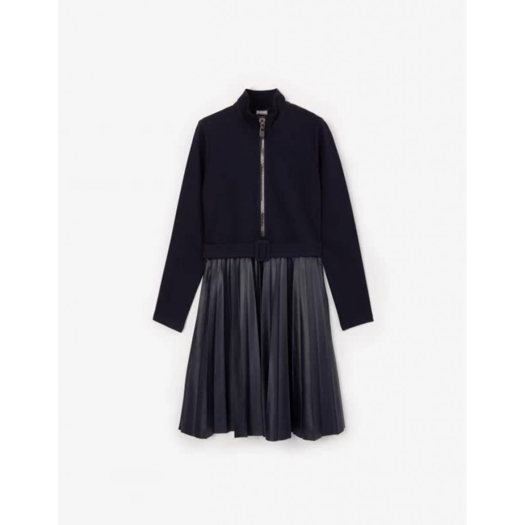 Синее платье прилегающего силуэта - превосходный вариант для будней школьницы. Модель построена на сочетании комфортного формоустойчивого трикотажного полотна джерси и тонкой эластичной искусственной кожи. Разная пластика и плотность матового и глянцевого материалов создают интересную игру фактур, делают платье приятным тактильно. Пояс с пряжкой и гофре на юбке придают платью легкость, утонченность, изящество. Акцентным элементом модели является пластиковая молния с блестящим металлизированным покрытием. Молния подчеркивает лаконичный дизайн модели, формирующий стильный деловой образ ученицы. Платье застегивается на потайную молнию в боковом шве. Шелковистая подкладка способствует комфортному скольжению изделия при эксплуатации.