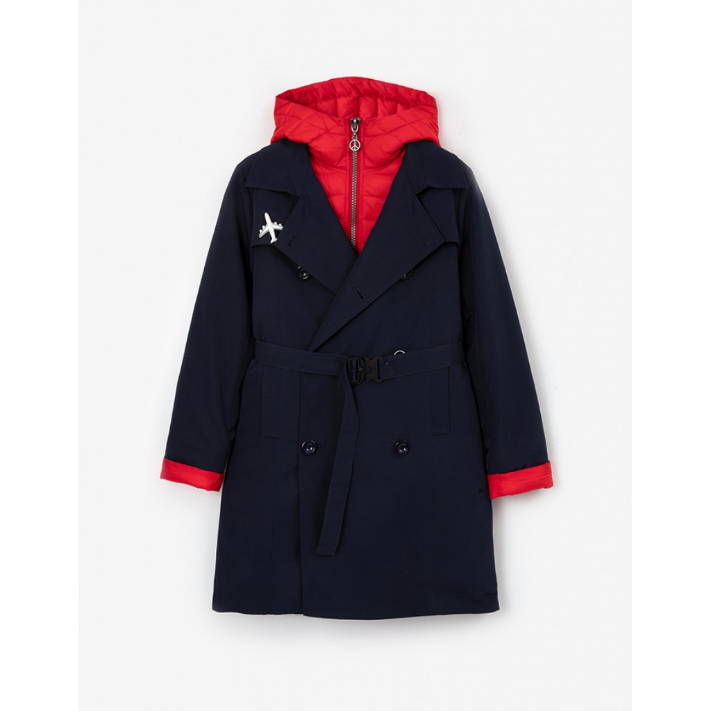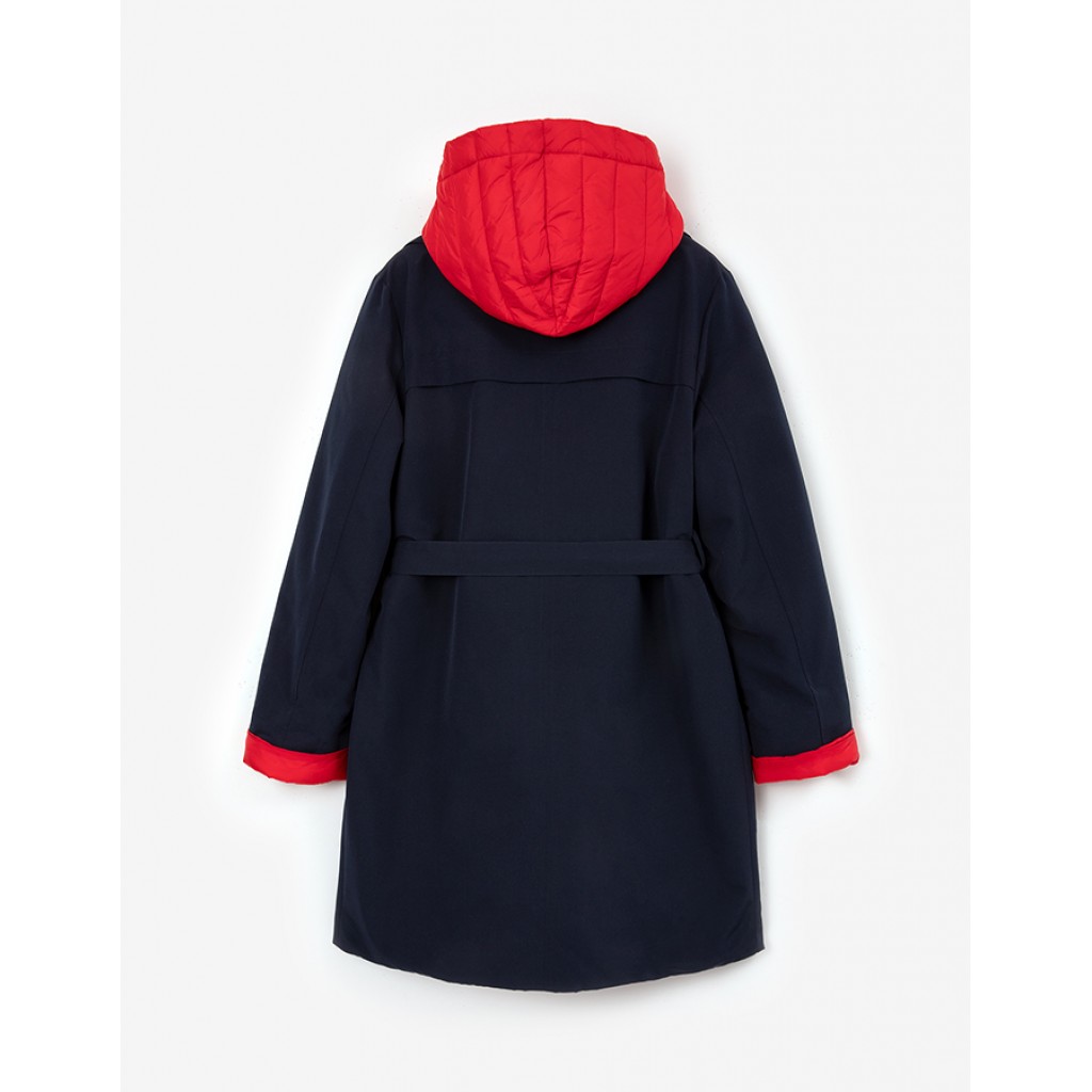 Синее пальто из плотной матовой плащовки на стеганой красной подстежке, выполненной из плащовки с легким глянцевым блеском, - бестселлер Gulliver! Яркая дизайнерская идея, имитация многослойности, цветовой и фактурный контраст делают пальто очень интересным, необычным, модным. Утеплитель подстежки искусственный пух и уютный капюшон позволяют носить пальто до глубокой осени. В оформлении пальто использована брендированная фурнитура и стильный съемный элемент для создания настроения.