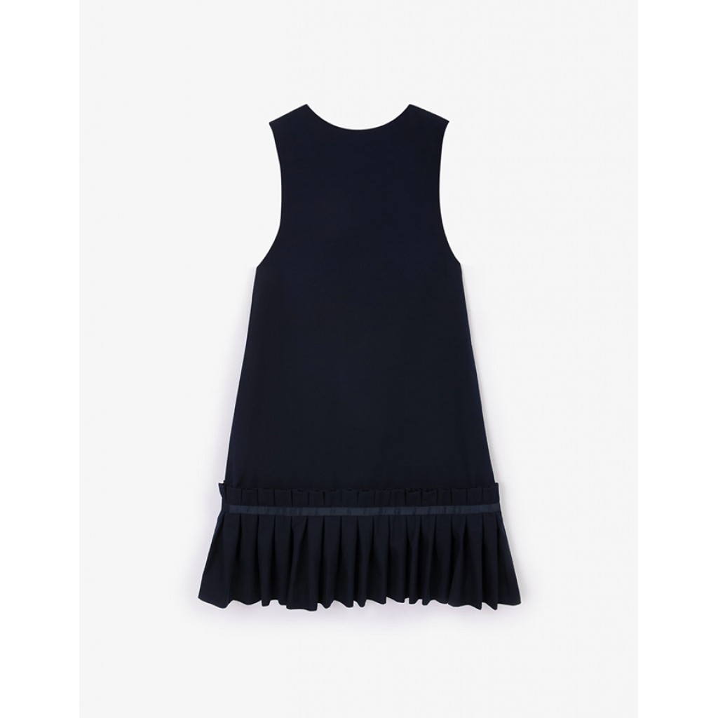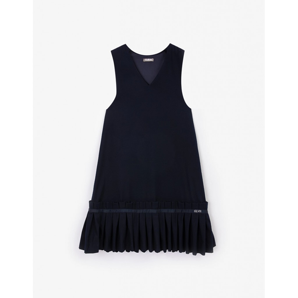 Синий сарафан трапециевидного силуэта с V-образным вырезом — для самых стильных учениц! Крупные складки по низу с отделкой репсовой тесьмой и маленькими стразами придают сарафану нотки кокетства. Выполненный из высокотехнологичного текстиля, он практически не мнётся, прекрасно держит форму и не требует особого ухода.