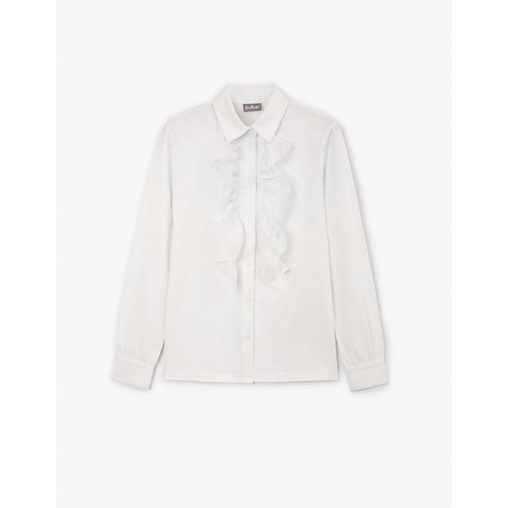 Блузка с длинным рукавом молочного цвета – элегантный акцент школьного гардероба. Блузка прямой свободной формы выполнена из мягкого хлопкового трикотажного полотна с эластаном, дарящего ощущение легкости, свежести, комфорта в течение дня. Центральная часть украшена чередой мелких текстильных рюшей, придающих школьным комплектам с ней нотку романтики. Молочная блузка для школы гармонично сочетается и с классическими юбками и брюками, и с модными трубами, и с палаццо, легко вписываясь как в строгие, так и в более непринужденные образы. Блузка застегивается на кнопки.