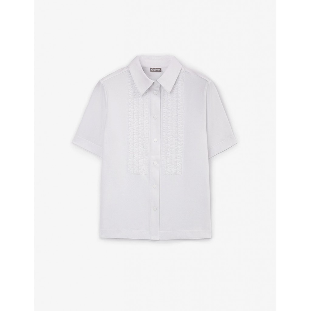 Белая трикотажная блузка с коротким рукавом – необходимая составляющая школьных образов для теплой осени или хорошо отапливаемых классов зимой. Блузка выполнена из мягкого хлопкового полотна с эластаном, дарящего ощущение легкости, свежести, комфорта в течение дня. Центральная часть украшена чередой мелких рюшей, придающих стильным комплектам с ней нотку романтики. Блузка гармонично сочетается и с классическими юбками и брюками, и с модными трубами, и с палаццо, легко вписываясь как в строгие, так и в непринужденные образы. Блузка застегивается на кнопки.