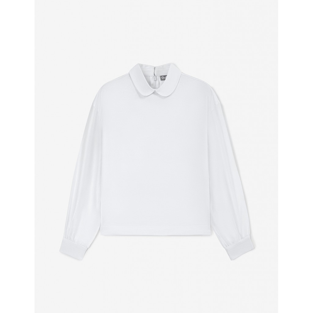 Белая школьная блузка с длинным  рукавом – важный атрибут гардероба девочки. Дизайн модели построен на сочетании фактур трикотажного полотна с эластаном, из которого выполнена основа блузки, и полупрозрачного вискозного шифона на рукавах. Прямой свободный крой, заниженная линия плеч и небольшой скругленный воротник из основного материала делают блузку воплощением гармоничного сочетания традиций и трендов. Она прекрасно впишется в образы с любыми текстильными и трикотажными брюками, юбками, сарафанами, создав строгий, скромный, элегантный образ ученицы. Блузка застегивается на потайную молнию на спинке.