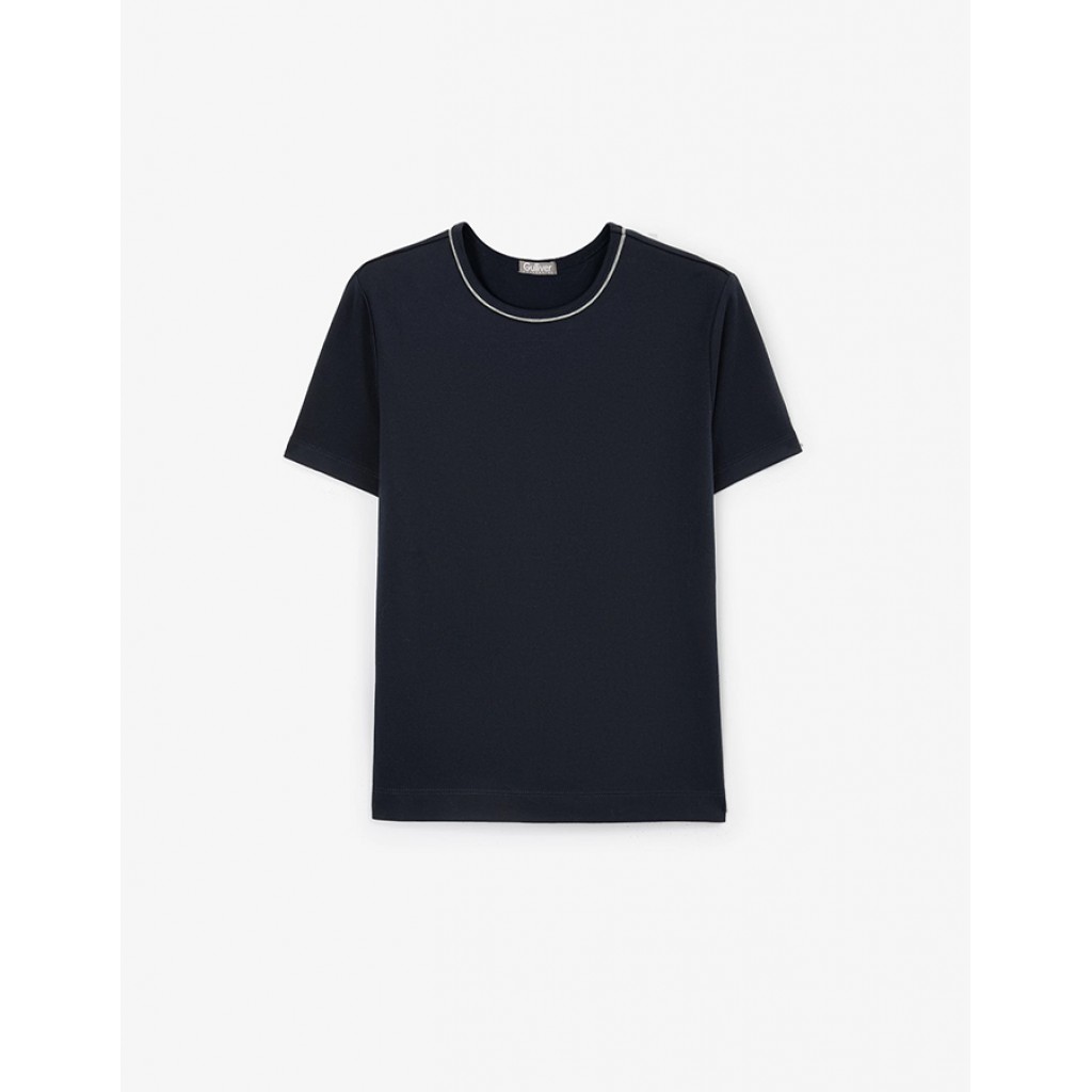 Синяя блузка с коротким рукавом - базовый элемент школьного гардероба. Изделие выполнено из мерсеризированного хлопкового интерлока, который отличается плотностью, прочностью, приятной к телу шелковистой текстурой. О-образная горловина блузки подчеркнута серым меланжевым кантом, добавляющим контрастный акцент и подчеркивающим  элегантность модели. Лаконичный интеллигентный дизайн делает блузку очень стильной, универсальной, гармонично сочетающейся с любыми юбками, брюками, сарафанами.