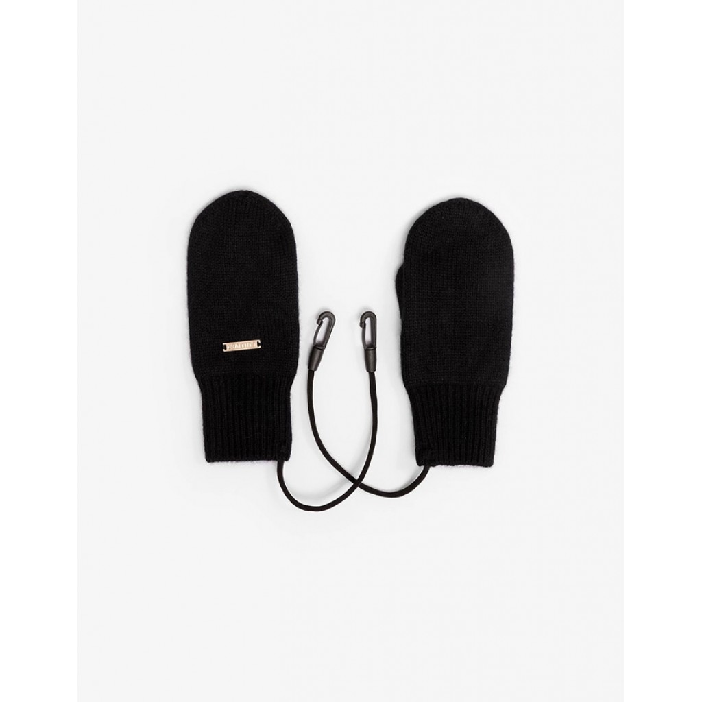 Черные вязаные варежки выглядят стильно и элегантно. Состав пряжи с высоким содержанием шерсти мериноса и ангорской шерсти делает варежки очень тёплыми, пушистыми и уютными. Брендированная металлическая табличка придаёт модели уникальность. Эластичные шнуры с пластиковыми карабинами позволяют прикреплять варежки к куртке или комбинезону для комфортной и безопасной эксплуатации.