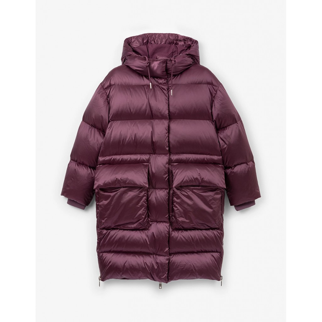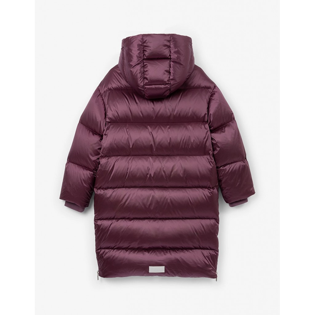 Бордовое стёганое пальто на натуральном пуху, выполненное из влагостойкой блестящей плащовки, проявит себя с лучшей стороны в суровых зимних условиях. Легкое и теплое, пальто прямой свободной формы с уютным капюшоном станет образцом стильной и практичной верхней одежды. Два вместительных накладных кармана с клапанами на кнопках, небольшие молнии в боковых швах для комфортного шага, глубокий капюшон с кордами и рибовые манжеты, внешняя ветрозащитная планка на кнопках создадут удобство и комфорт в эксплуатации изделия. Пальто застёгивается на металлическую молнию с брендированными пулерами. На спинке изделия расположена светоотражающая нашивка, способствующая безопасности девочки в тёмное время суток.