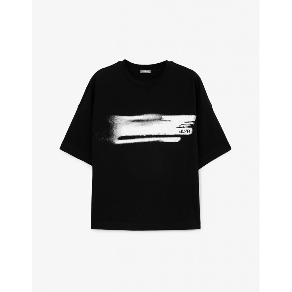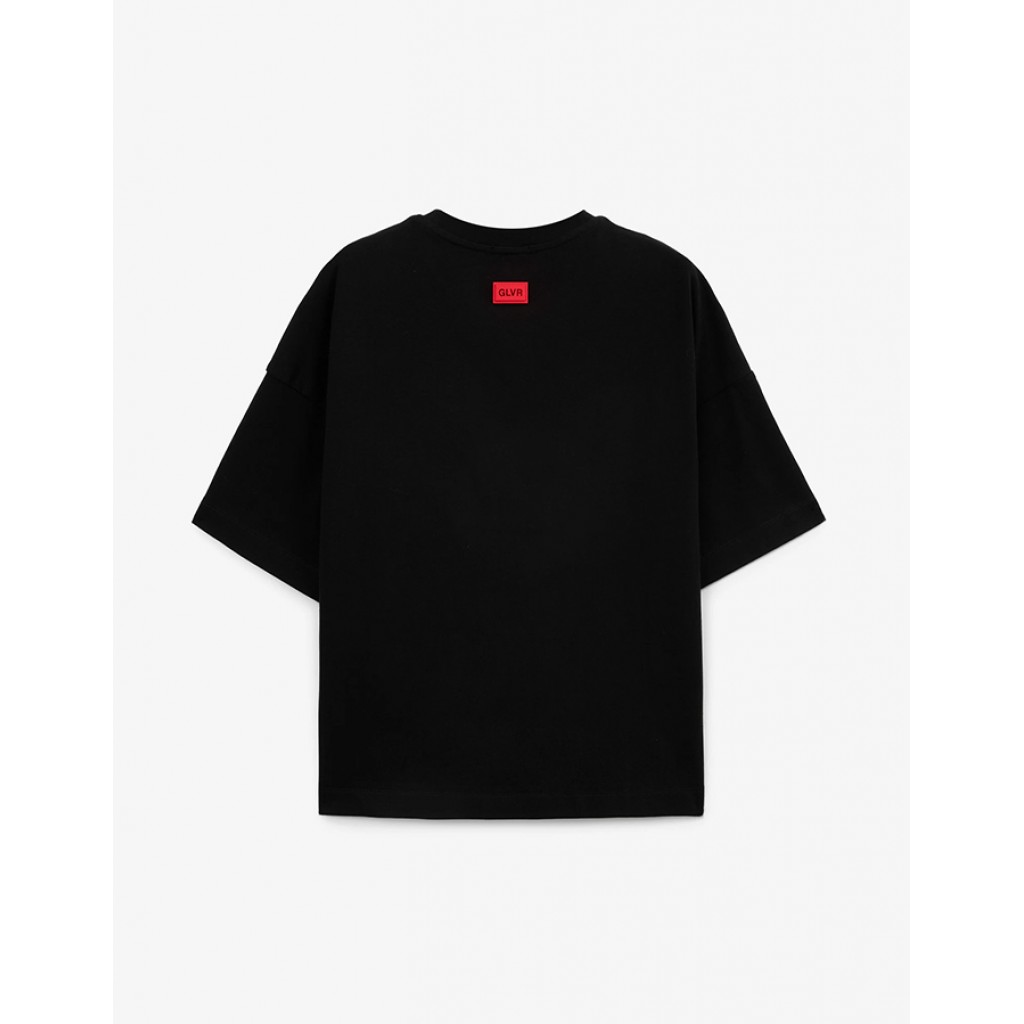 Черная футболка оверсайз с коротким рукавом - вещь не только стильная, но и универсальная. Контрастный абстрактный черно-белый принт со шрифтовыми элементами делает базовую по форме футболку модной, острой, современной. Она подойдет к большинству функциональных  решений в гардеробе подростка, став интересным акцентом или дополнением образа. В оформлении модели использована силиконовая нашивка со шрифтовым тиснением.