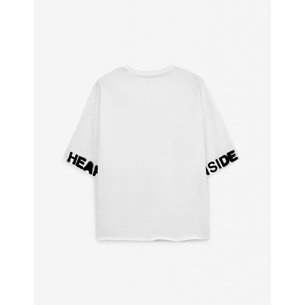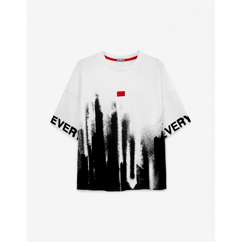 Белая хлопковая футболка оверсайз с коротким рукавом - вещь не только  стильная, но и универсальная. Контрастный абстрактный принт со шрифтовыми элементами делает базовую по форме футболку модной, острой, современной. Она подойдет к большинству функциональных  решений в гардеробе подростка, став интересным акцентом или дополнением образа. Открытые срезы по рукавам и нижнему краю придают изделию бунтарский гранжевый вайб.