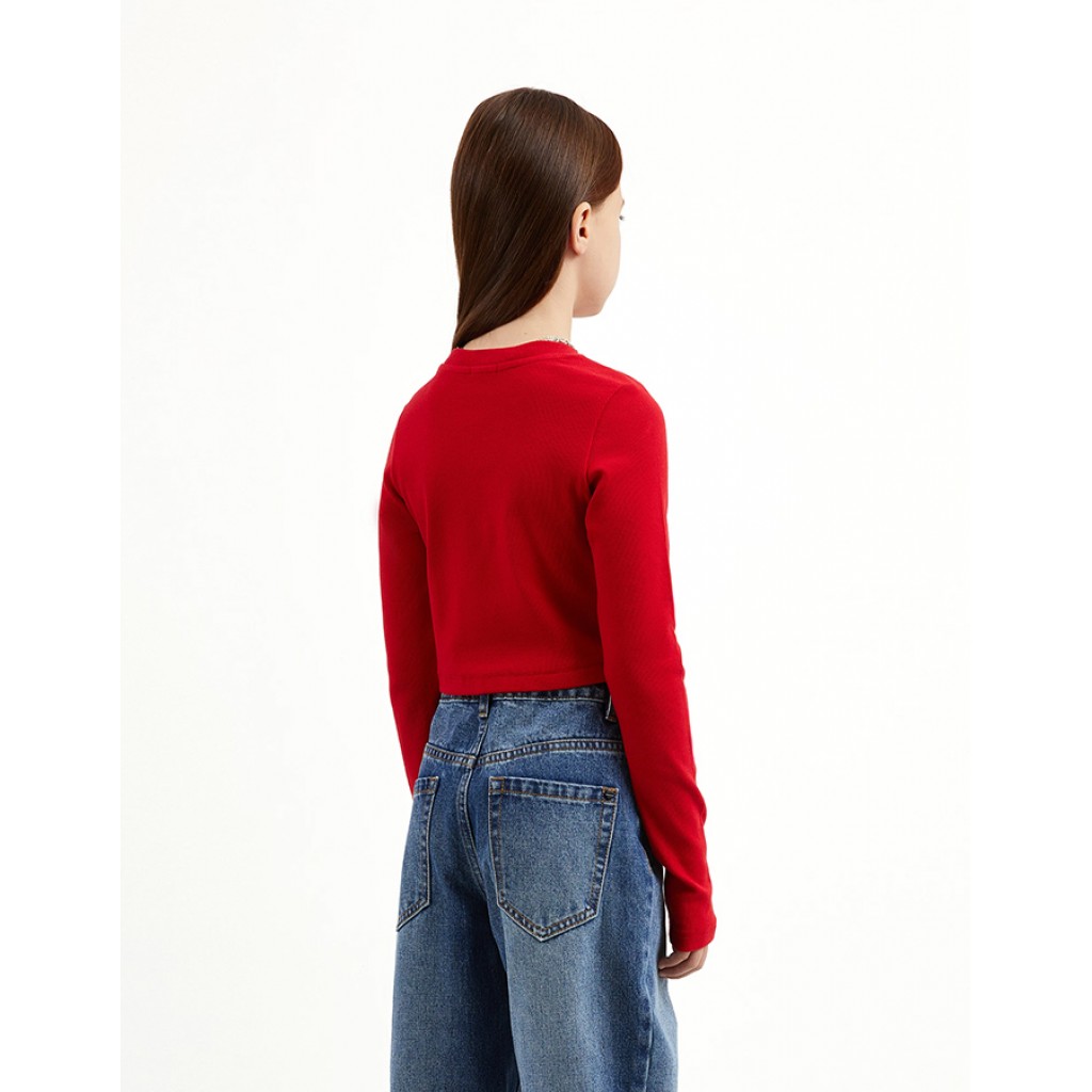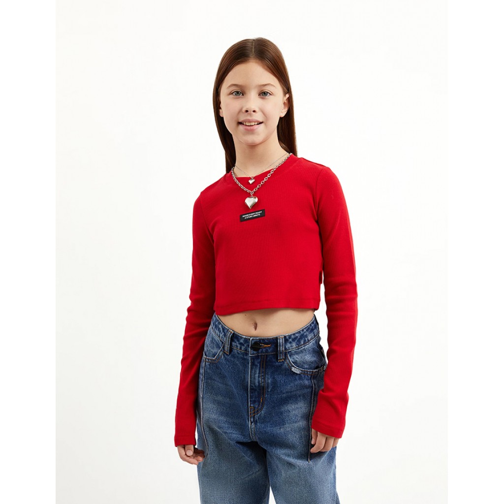 Укороченный лонгслив прилегающего силуэта - прекрасный выбор девочки-подростка, идущей в ногу со временем. Красный лонгслив из мягкого пластичного риба подчеркнет стильный лаконичный образ в соответствии с трендами. Хлопок с эластаном в составе гарантируют мягкость, гигроскопичность, хорошую пластику изделия, простоту в эксплуатации и уходе. В оформлении модели использована жаккардовая нашивка со шрифтовым принтом.