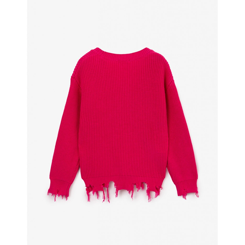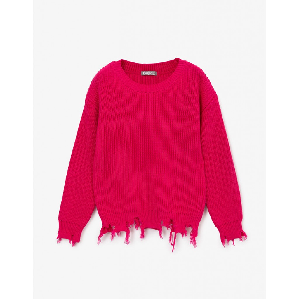 Джемпер из мягкой хлопковой пряжи, выполненный в легком гранжевом стиле с рваными краями, станет яркой изюминкой в гардеробе девочки с бунтарскими нотками в характере. Привлекающий внимание модный цвет фуксии не позволит образу остаться незамеченным. Объемный расслабленный крой, предполагающий ношение джемпера как единичного изделия, так и поверх рубашек, футболок, других плечевых изделий, обеспечит удобство, комфорт, свободу движений.