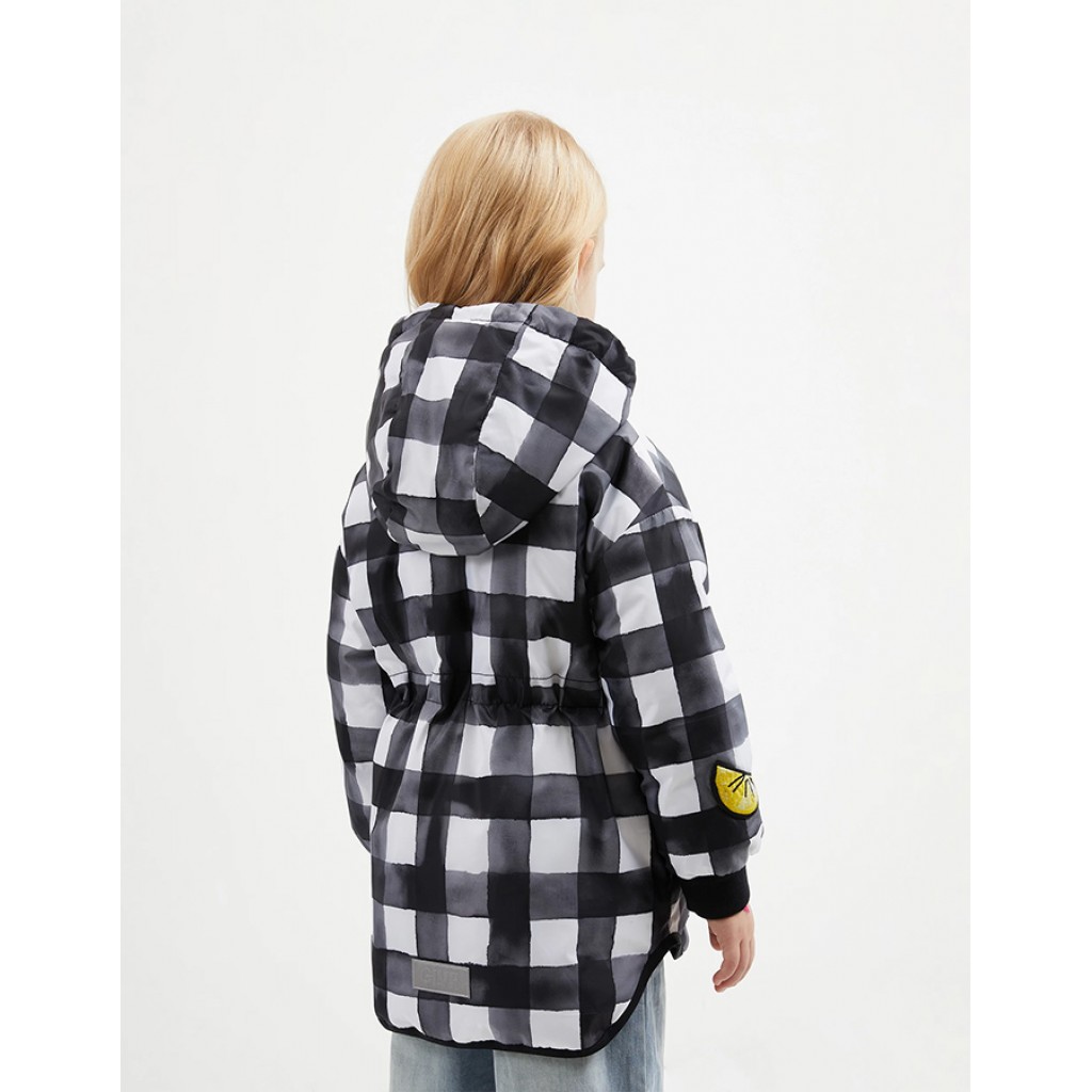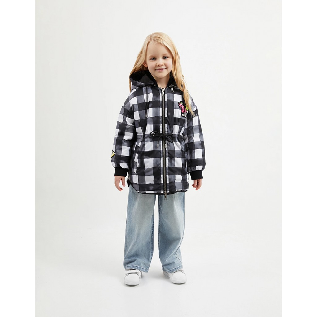 Демисезонное пальто для девочки прямой свободной рубашечной формы - непременный атрибут стильного и функционального весеннего гардероба! Изюминка модели - оригинальная клетка, созданная в легкой акварельной технике на матовой влагостойкой плащовке. Она прекрасно гармонирует с черной, стеганой вместе с утеплителем-синтепоном, подкладкой, создавая необходимый и приятный для визуального восприятия цветовой контраст. Однотонную подкладку поддерживают черные детали: рибовые манжеты и воротник-полустойка, шнуры-утяжки по линии талии и отстегивающегося капюшона, окантовка-тесьма по закругленному нижнему краю изделия, внутренняя ветрозащитная планка. Полупальто застегивается на двухзамковую металлическую молнию. Карманы-листочки с фиксацией на внутренние кнопки создают удобство в эксплуатации вещи. В оформлении модели использован оригинальный декор - тематическая фигурная аппликация с прозрачными пайетками, служащая ярким цветным акцентом, силиконовая брендированная нашивка, а также светоотражающий патч на спинке, способствующий безопасности девочки в темное время суток.