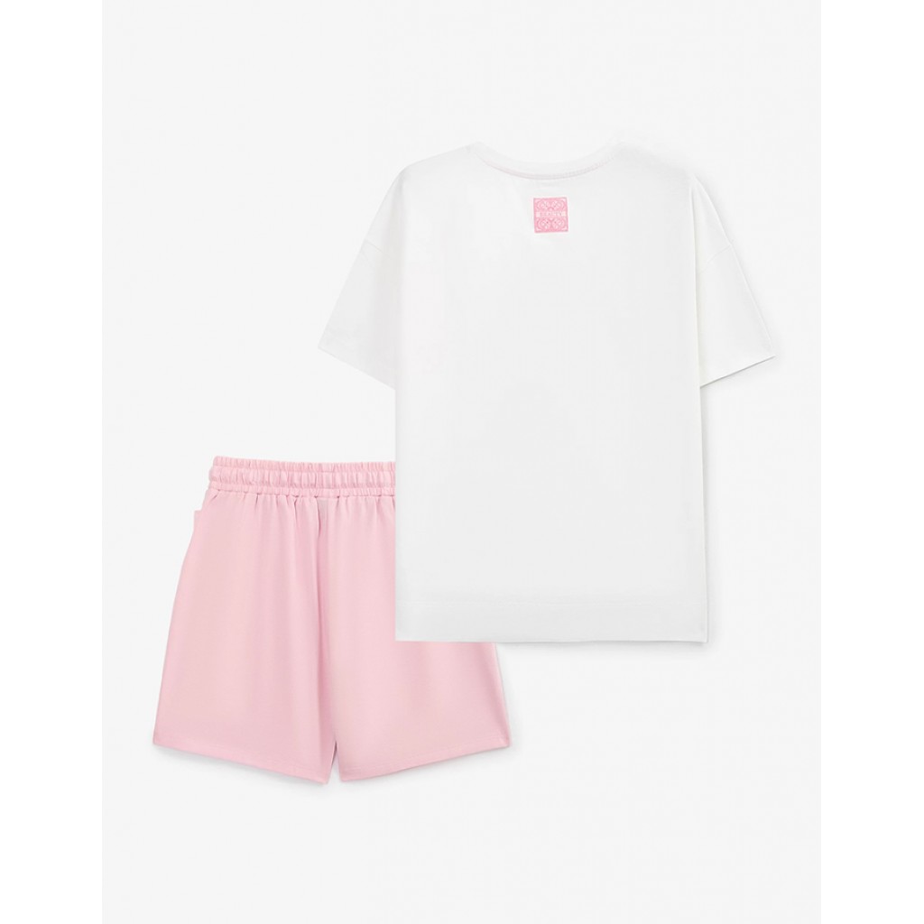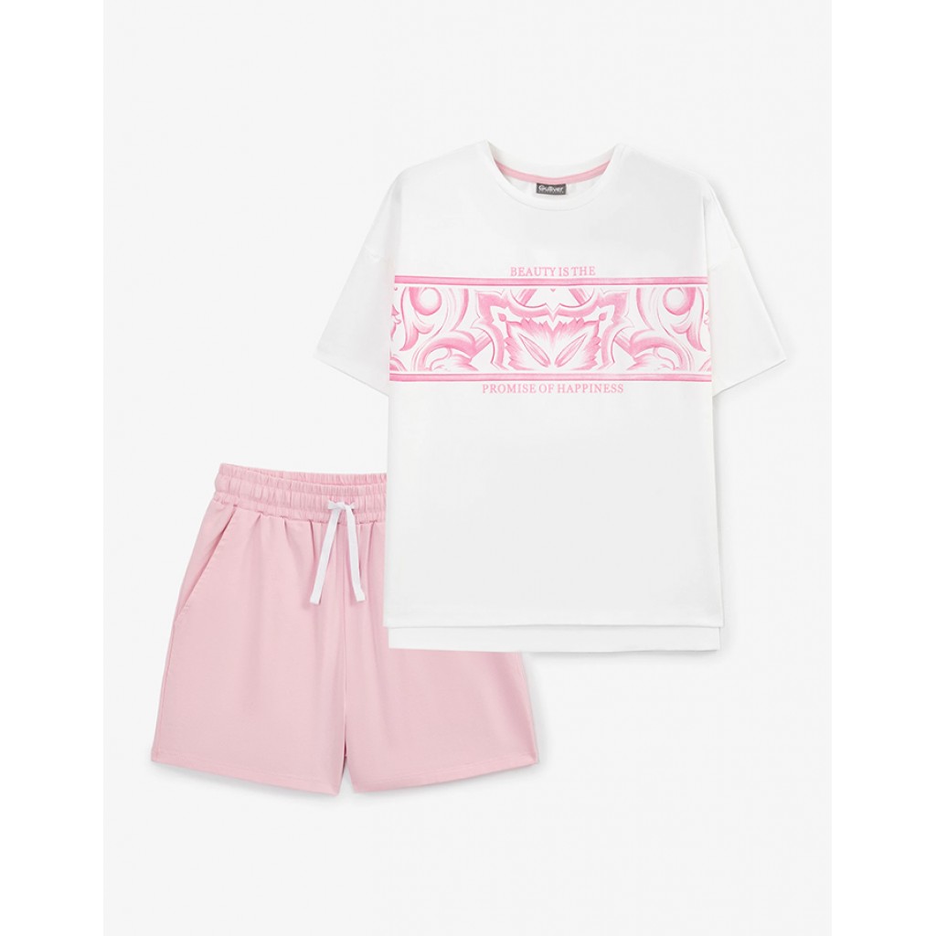 Окунуться в волшебный мир снов вдвойне приятно в этой пижаме, состоящей из белой свободной футболки со спущенной линией плеч и комфортных розовых шортов. Пижама выполнена из пластичного трикотажа с доминирующим содержанием хлопка. Материал мягок и приятен на ощупь, прост в уходе и эксплуатации. В оформлении футболки использован принт с узором, шрифтовые элементы и небольшая нашивка. Шорты имеют карманы и эластичный пояс с кордами.