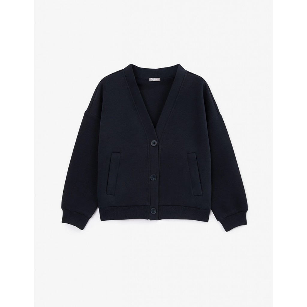 Темно-синий кардиган для девочки свободного кроя – стильное и практичное завершение школьных комплектов. Кардиган выполнен из мягкого хлопкового интерлока, обладающего гладкой, приятной на ощупь поверхностью. Интерлок мягок, износостоек, отлично держит форму, прост в уходе, что способствует комфортной эксплуатации изделия на протяжении всего школьного сезона. Минималистичный дизайн, V-образное решение горловины делают модель универсальным вторым слоем для любых школьных образов и не только. Кардиган имеет карманы-листочки - важный функциональный элемент для удобства ребенка. Кардиган застегивается на пуговицы.