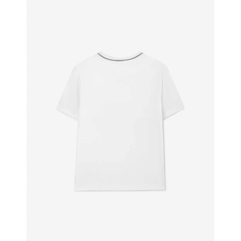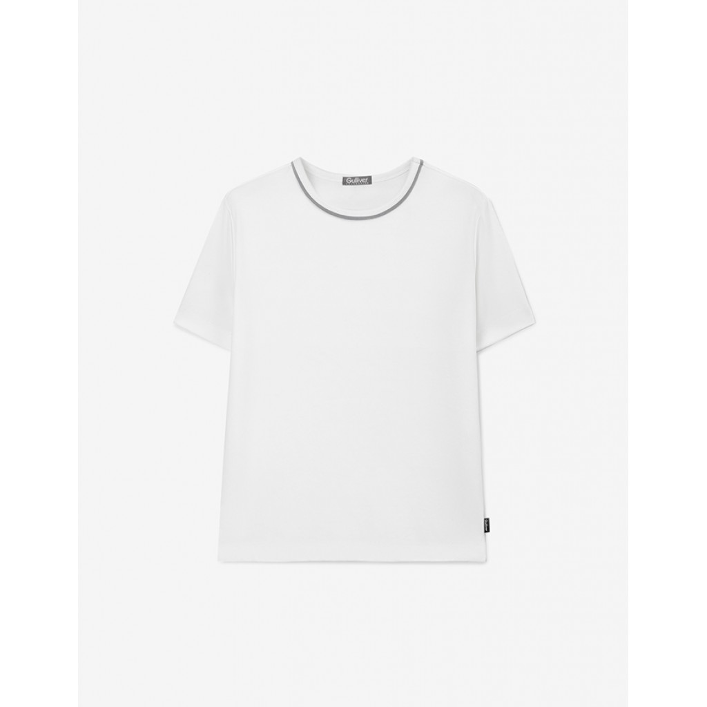 Белая блузка с коротким рукавом - базовый элемент школьного гардероба. Изделие выполнено из мерсеризированного хлопкового интерлока, который отличается плотностью, прочностью, приятной к телу шелковистой текстурой. О-образная горловина блузки подчеркнута серым меланжевым кантом, добавляющим контрастный акцент и подчеркивающим  элегантность модели. Лаконичный интеллигентный дизайн делает блузку очень стильной, универсальной, гармонично сочетающейся с любыми юбками, брюками, сарафанами.