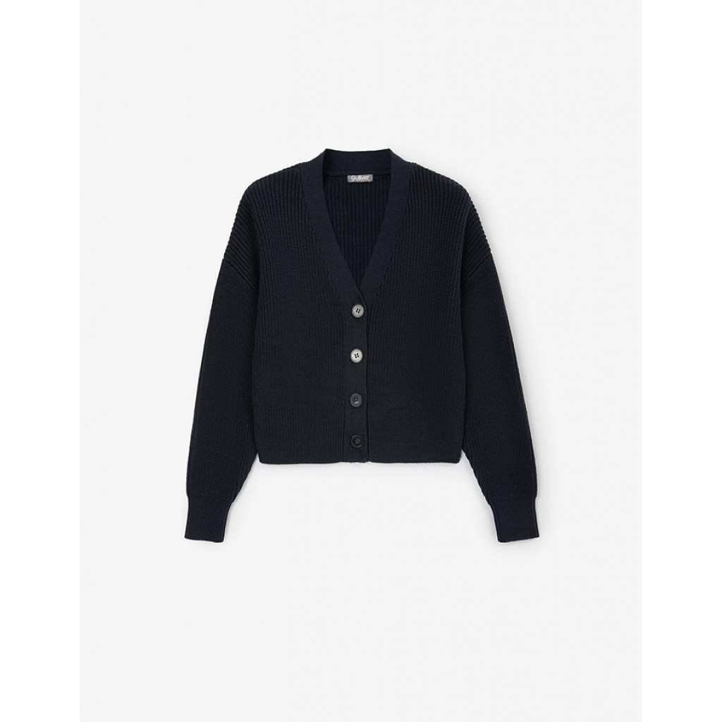 Укороченный вязаный кардиган –стильная и комфортная вещь, способная подчеркнуть модные пропорции в школьном комплекте. V-образная горловина позволяет сочетать кардиган с любыми блузками, платьями, в том числе, имеющими банты, рюши на передней части. Кардиган выполнен из мягкой смесовой пряжи из вискозы и хлопка, очень приятной при тактильном контакте. Кардиган застегивается на пуговицы.