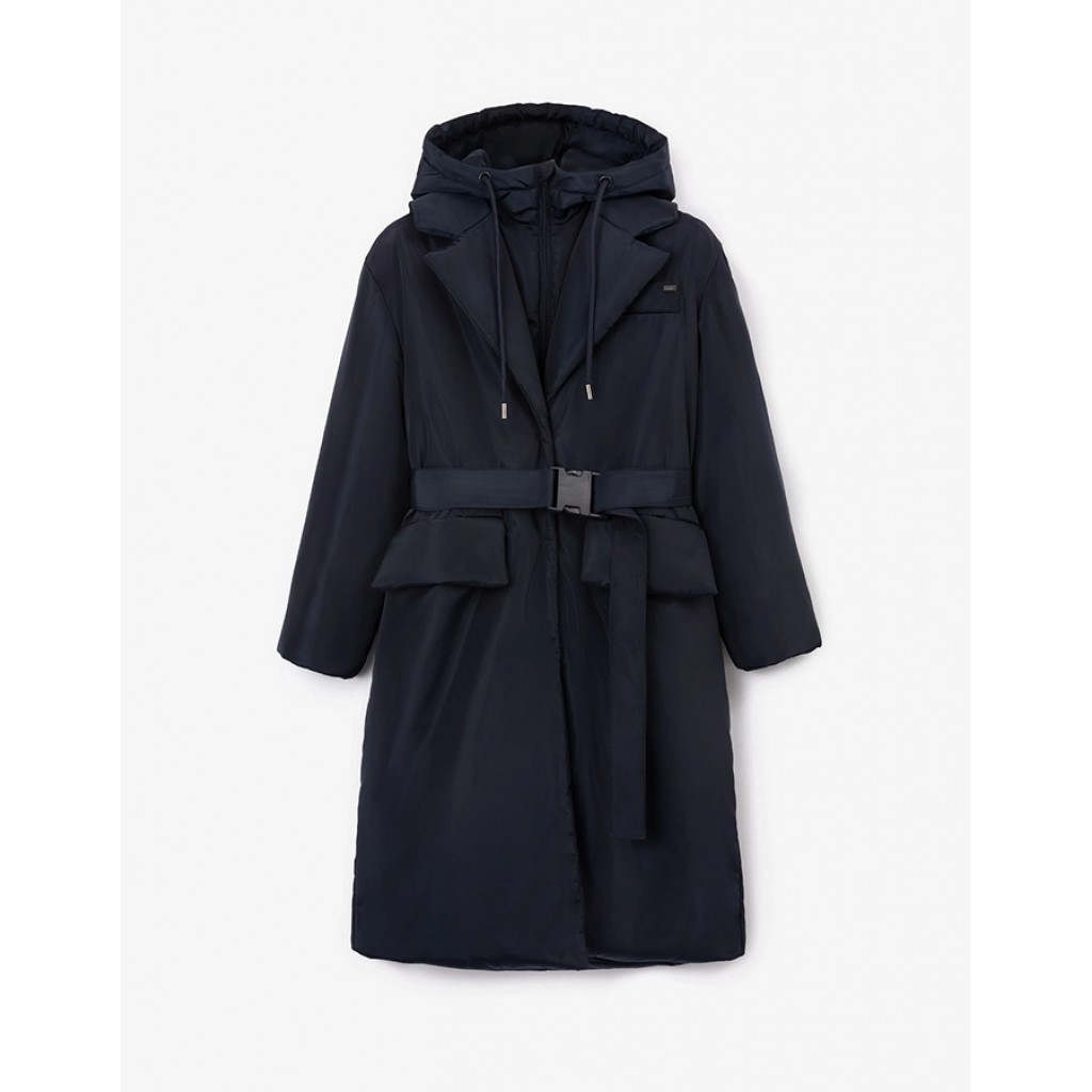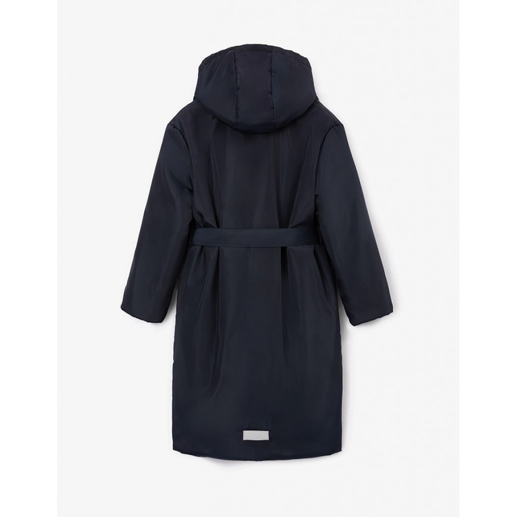 Синее пальто из плотной влагостойкой плащовки — стильное и практичное решение для строгого гардероба девочки в прохладное время года. Пальто прямой свободной формы с заниженной линией плеч на утеплителе - синтепоне позволит без труда носить его с объемным  нижним слоем: пиджаком, кардиганом, жилетом. Особенность модели - отстегивающаяся манишка с капюшоном на молнии. Синяя манишка — не только выразительный элемент дизайна, создающий имитацию многослойности, но и важная функциональная деталь, позволяющая составлять разные по стилистике образы. С капюшоном пальто выглядит модно и динамично, без него - стильно и элегантно. Удобные прорезные  карманы с объемными клапанами обеспечивают комфорт в повседневной эксплуатации. Съемный пояс с застежкой на пластиковый фастекс позволяет варьировать посадку, делая акцент на линии талии. На спинке размещён светоотражающий элемент, повышающий безопасность подростка в тёмное время суток. Пальто застегивается на невидимые с лицевой стороны пришивные кнопки.