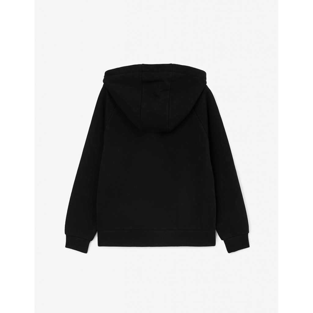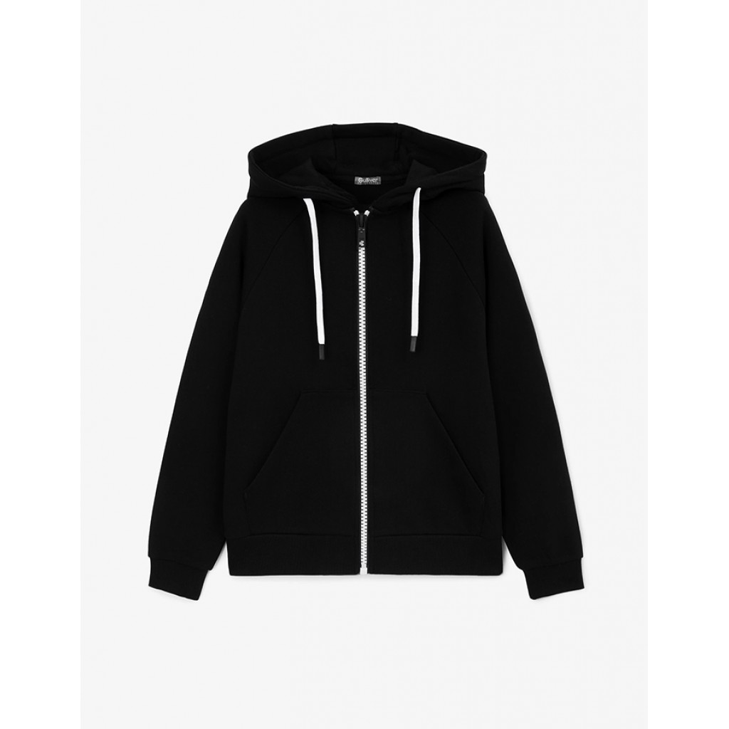 Черная распашная толстовка с капюшоном – стильный и практичный элемент гардероба, отлично подходящий для уроков физкультуры на улице. Она - важнейшая составляющая комплекта "спортивная форма для школы", делающая занятия на свежем воздухе очень комфортными. Толстовка выполнена из хлопкового футера с мягкой, приятной при тактильном контакте петельчатой изнанкой. Эластичный риб по низу изделия и манжетам, а также накладные карманы, подобные кенгуру, делают толстовку удобной и функциональной для подростка. Контрастная застежка на тракторную молнию создает динамичный акцент.