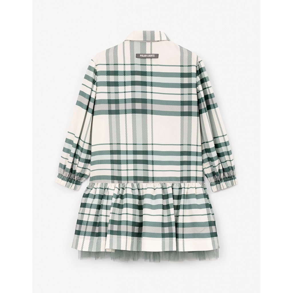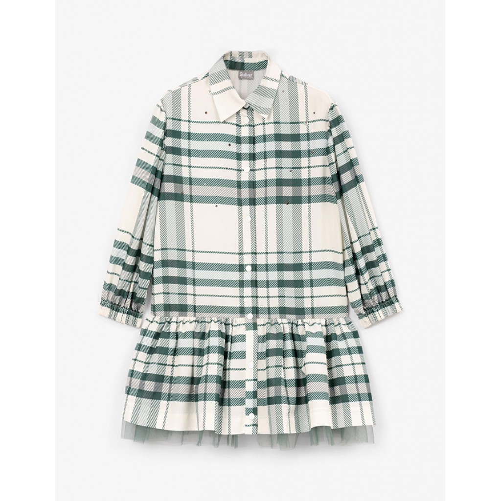 Платье рубашечного кроя в стильную клетку тартан цвета морской волны - прекрасный выбор для элегантных образов в осенне-зимнем сезоне. Платье выполнено из мягкого, тактильно приятного и невероятно легкого текстиля на основе вискозы. Хлопковая подкладка юбки усилена дополнительным слоем сетки для придания большего объема. Изюминка модели - россыпь страз на передней части платья, придающая ему деликатный блеск и сияние. Платье застегивается на кнопки, имитирующие пуговицы.
