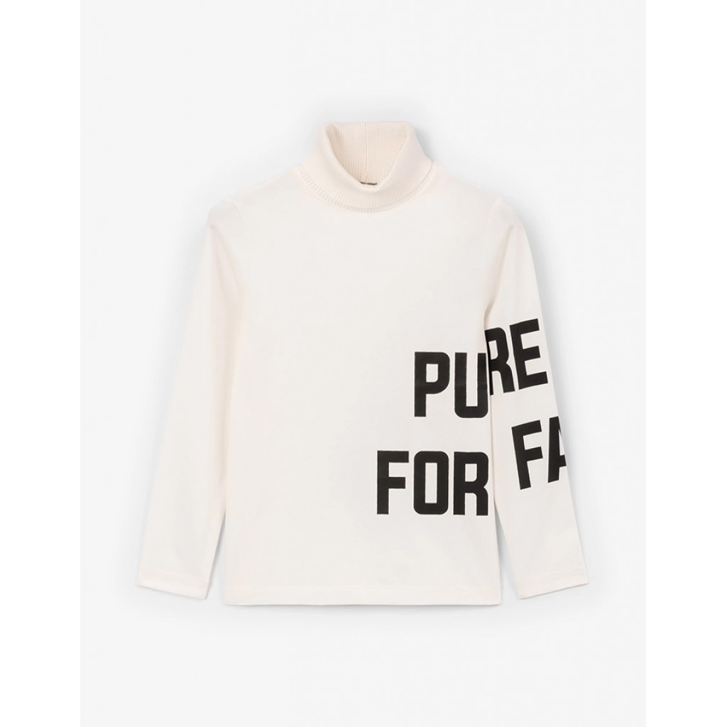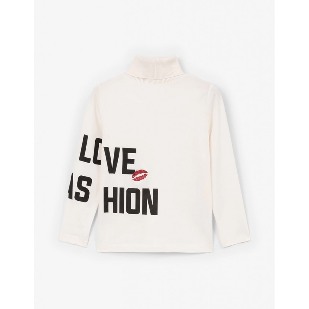 Белая трикотажная водолазка – прекрасное решение для формирования стильного и функционального осеннего гардероба девочки. Водолазка выполнена из мягкого хлопкового полотна с эластаном, очень приятного при тактильном контакте. Высокая горловина, связанная из мягкой хлопковой пряжи, создает красивую игру фактур и надежно защищает в холодное время года. Дизайн модели построен на контрастном асимметричном шрифтовом принте, проходящем по передней части, рукаву и спинке. Он придает модели остроту и современность, делает водолазку акцентным элементом модных и комфортных повседневных образов.