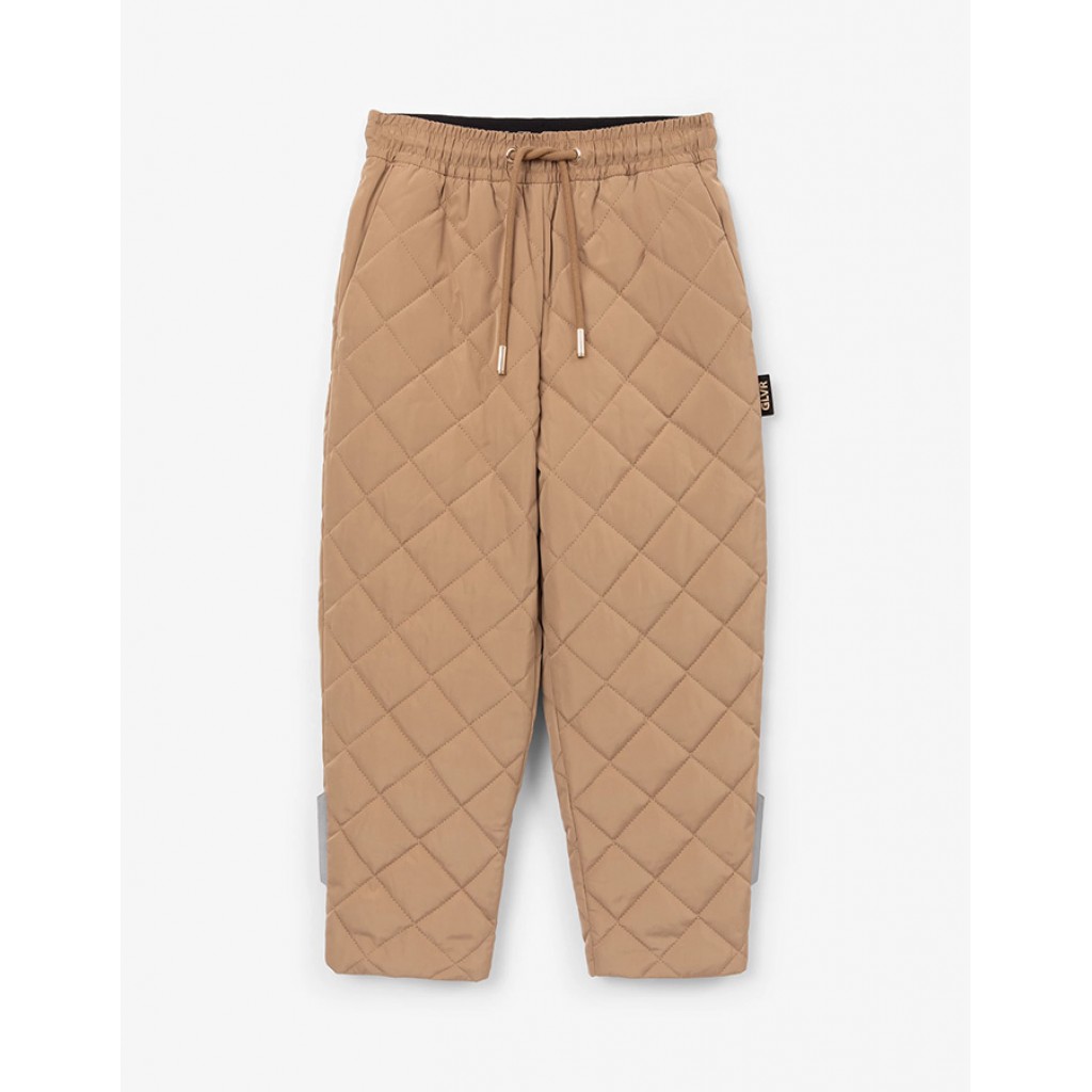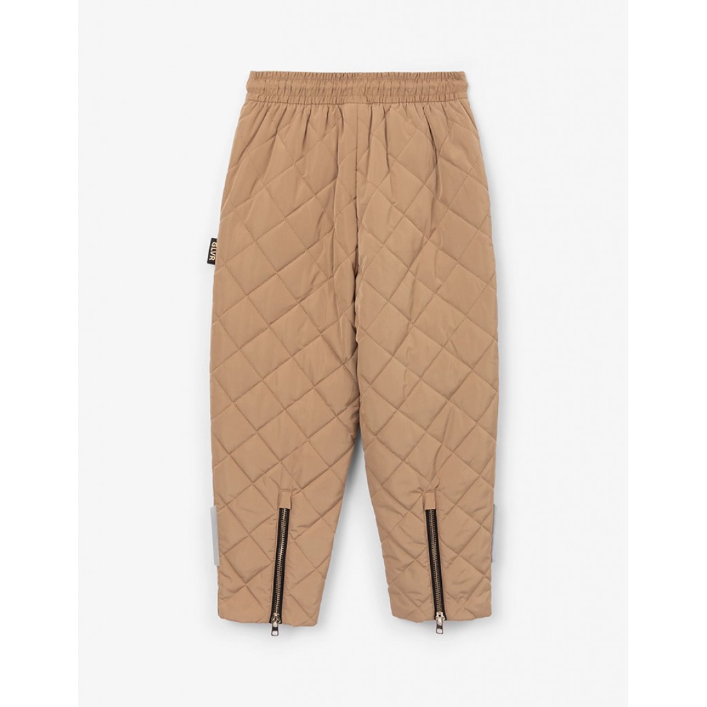 Стёганые брюки на утеплителе - синтепоне - необходимый элемент демисезонного гардероба девочки. Брюки выполнены из плотной матовой плащовки, обладающей влагоотталкивающими и ветрозащитными свойствами, что особенно важно в холодный сезон. Изюминка модели - в диагональной квадратной стежке и металлических молниях по низу брюк, позволяющим регулировать их объем и сочетать с любой зимней обувью. Эластичный пояс с кордами обеспечивает плотное прилегание к талии.