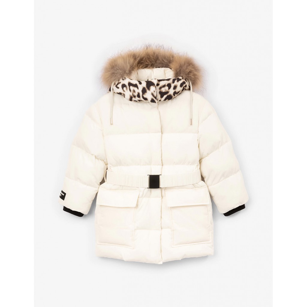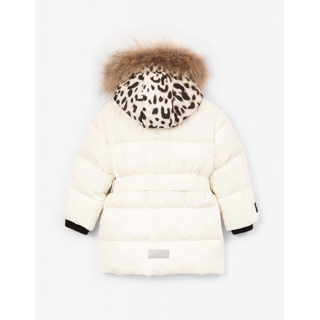 Теплое стеганое полупальто благородного молочного цвета, выполненное из матовой влагостойкой плащовки, - стильный акцент зимнего образа! Дизайн модели построен на сочетании однотонного материала верха и леопардовой отделки: подкладки и капюшона. Прямая свободная форма, наполнитель - искусственный пух, трикотажные рибовые манжеты, внутренние утяжки по низу, пояс делают полупальто максимально комфортным, исключающим продувание. Съемный капюшон с отстегивающимся мехом енота обеспечивает надежную защиту в снежные и морозные дни. Полупальто имеет два удобных объемных накладных кармана с клапанами, застёгивается на молнию с акцентным пулером-сердечком, имеющую внешнюю ветрозащитную планку на кнопках. Внутренняя часть полупальто оснащена специальными лямками из эластичной тесьмы, позволяющими в помещении носить его за спиной как рюкзак, оставляя руки свободными. На спинке изделия расположен светоотражающий шеврон, способствующий безопасности девочки в тёмное время суток.