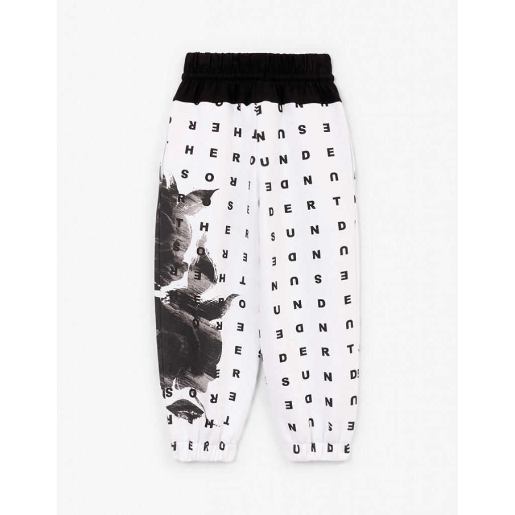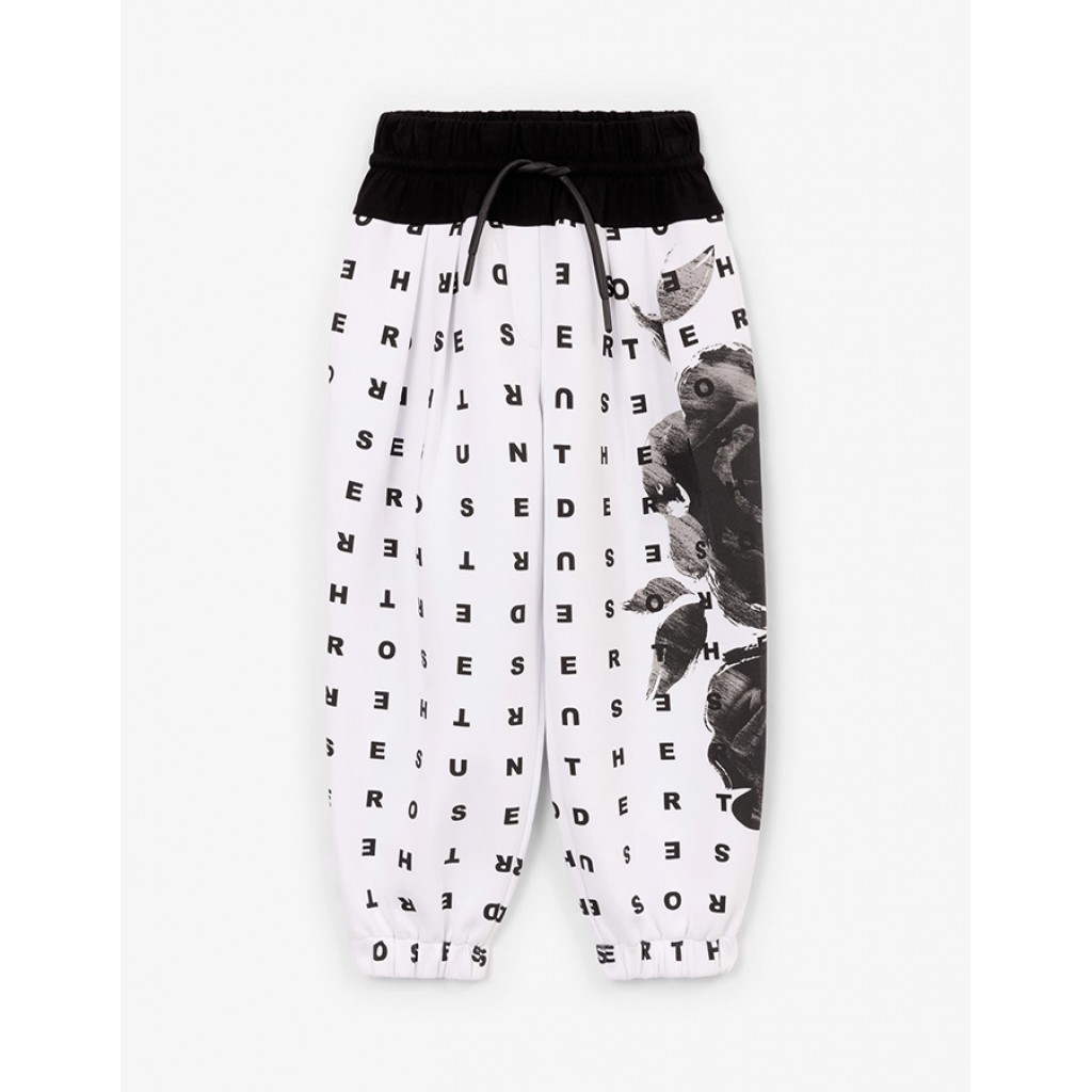 Брюки-джоггеры - интересный и небанальный вариант для стильных образов девочки в осенне-зимний период. Брюки выполнены из гладкого, тактильно приятного хлопкового интерлока с модным оригинальным рисунком. Ритмичные шрифтовые элементы и крупный флористический мотив, расположенный асимметрично, выглядят очень стильно, интересно, по-новому, завораживая остротой и неординарностью графического решения. Контрастный пояс на резинке с кордами, а также карманы в боковых швах делают эксплуатацию изделия максимально комфортной.