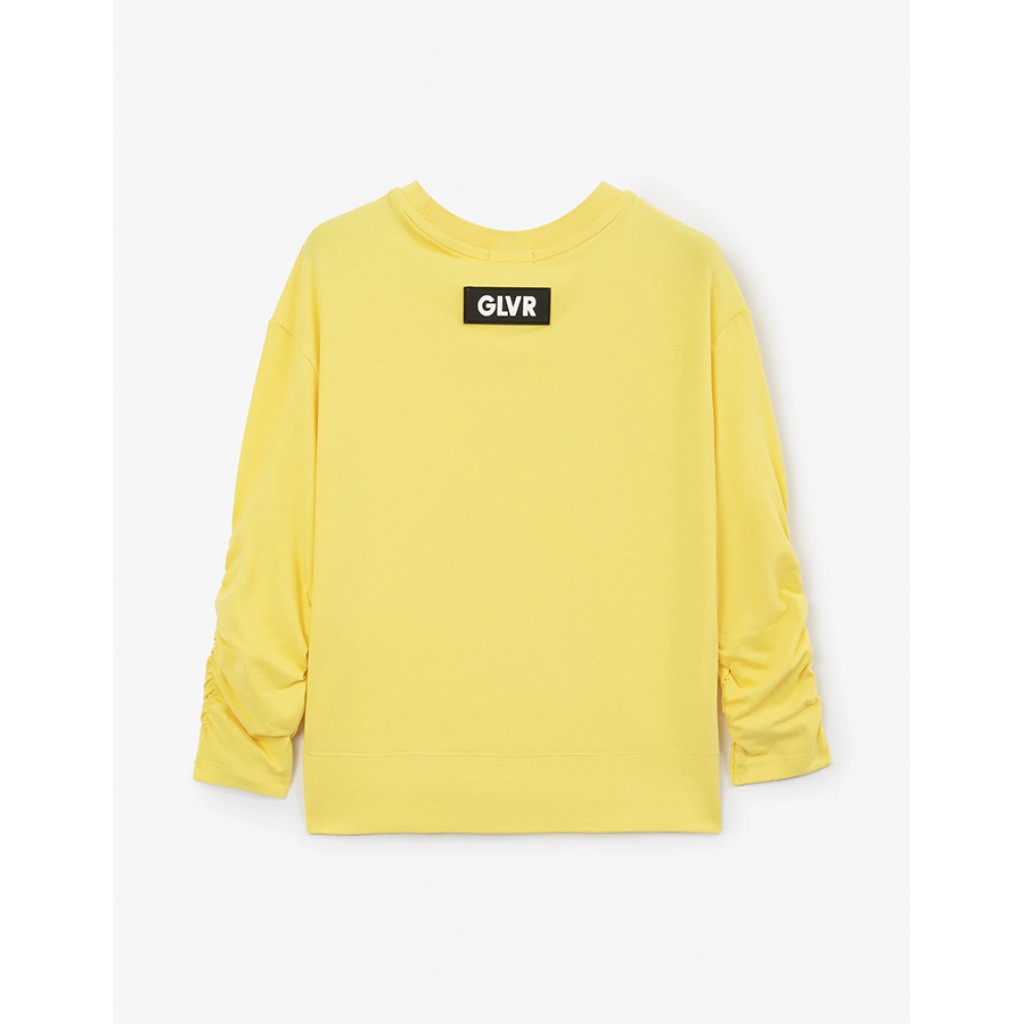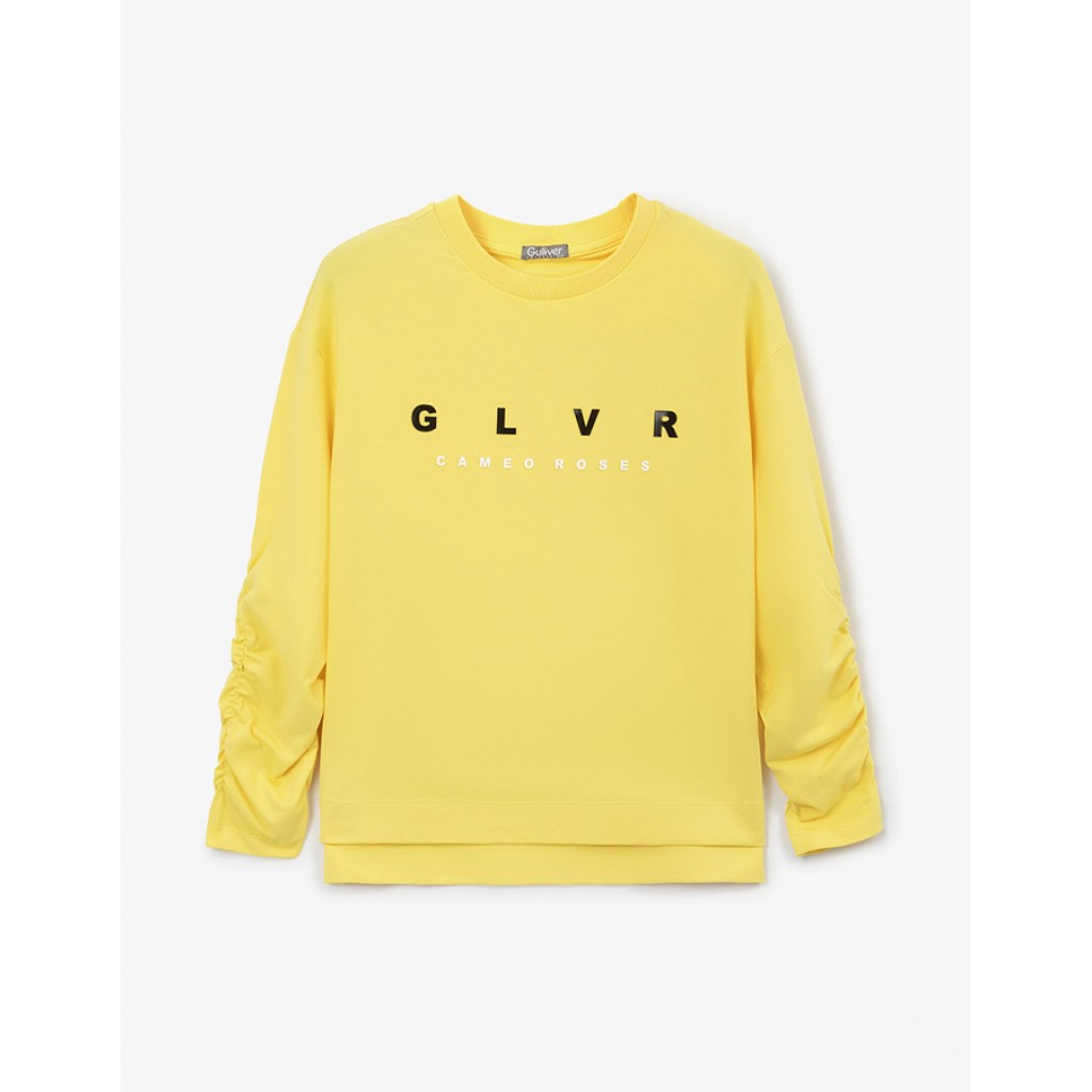 Лонгслив прямой свободной формы со спущенной линией плеч - необходимая базовая вещь зимнего гардероба девочки. Желтый лонгслив выполнен из мягкого хлопкового полотна с эластаном, очень приятного при тактильном контакте. На передней части модели расположен лаконичный шрифтовой принт, на спинке - минималистичная нашивка.