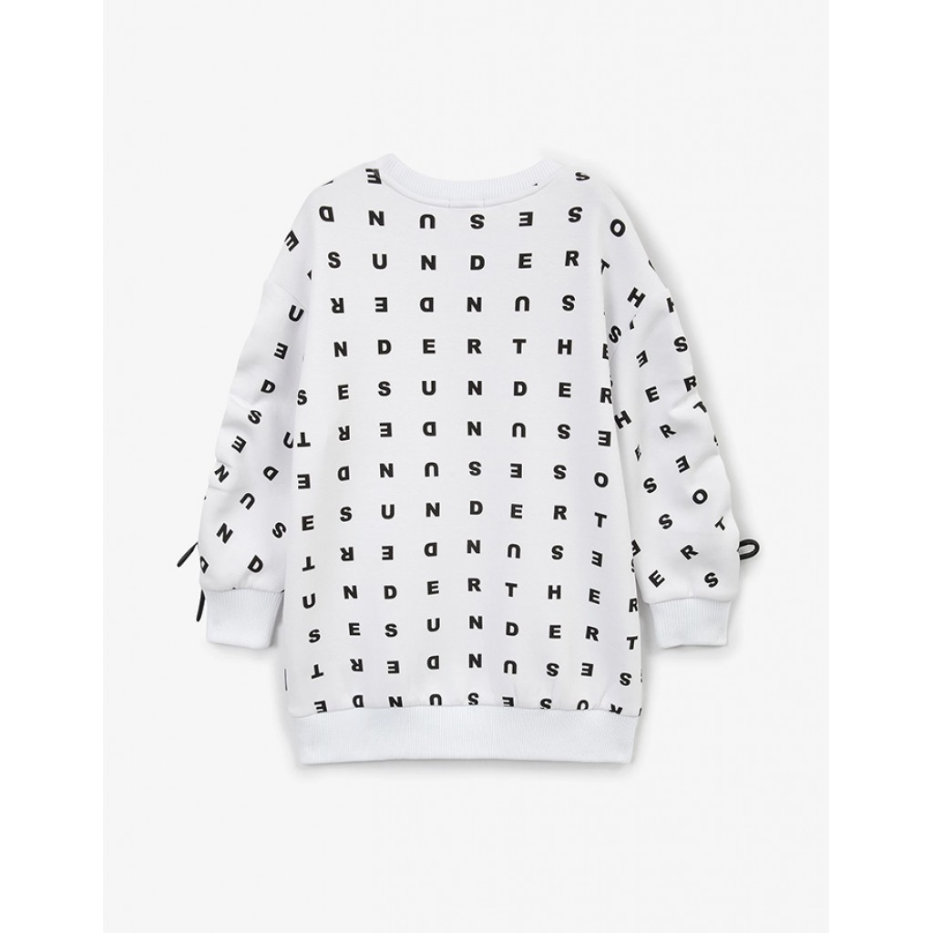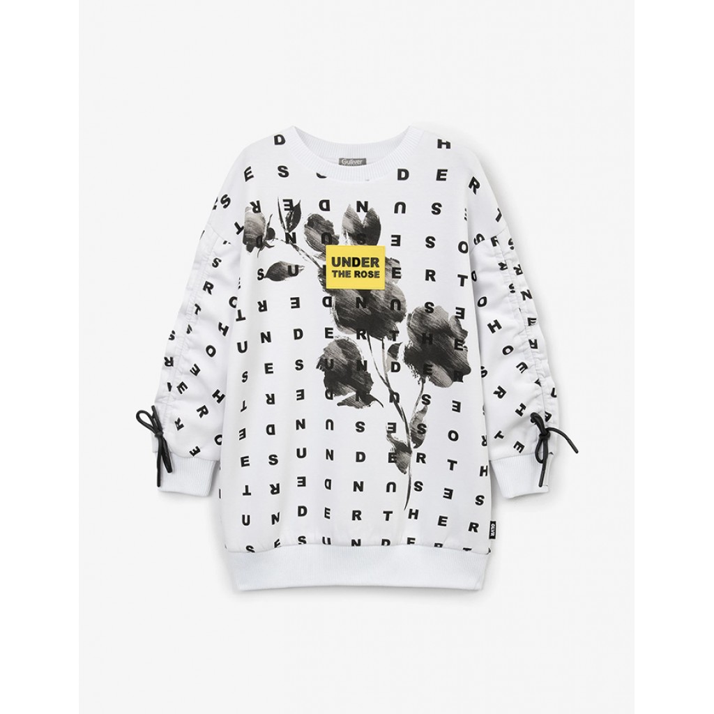 Белое трикотажное платье прямой свободной формы со спущенной линией плеч — интересный и небанальный вариант для стильных образов девочки в осенне-зимний период. Платье выполнено из мягкого, гладкого, тактильно приятного хлопкового интерлока с модным оригинальным рисунком. Ритмичные шрифтовые элементы и крупный флористический мотив выглядят очень стильно, интересно, по-новому, завораживая остротой и неординарностью графического решения. Особенность модели - акцентные вертикальные утяжки на рукавах, завершающиеся ниспадающими кордами. Они являются не только выразительным элементом дизайна, но и функциональной чертой платья, позволяющей регулировать плотность сборки и длину рукава. Платье имеет рибовую горловину, манжеты и резинку по низу, формирующую модный О-образный силуэт изделия.