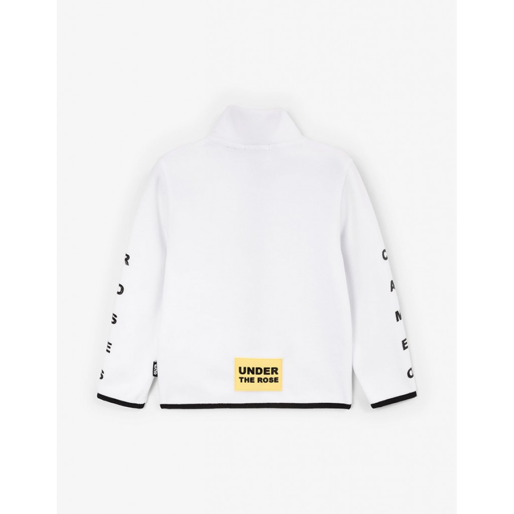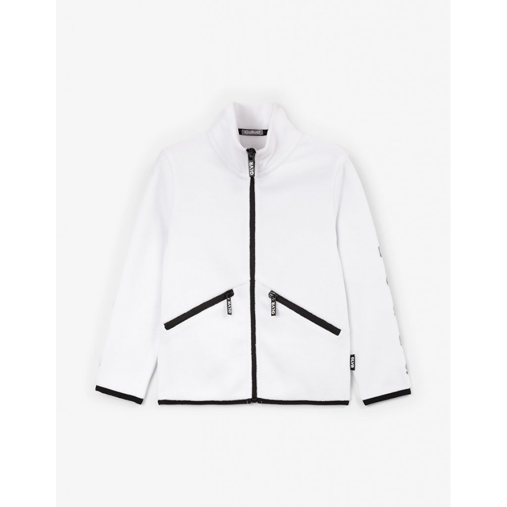 Белая распашная толстовка полуприлегающего силуэта из мягкого и приятного на ощупь флиса отлично согреет в морозный день, прекрасно вписавшись в зимний гардероб девочки. Пластичная, практичная, комфортная, она станет теплым и уютным вторым слоем, не препятствующим свободе движений во время активного времяпрепровождения на свежем воздухе. Дизайн толстовки построен на цветовом контрасте материала верха и молний с брендированными пулерами на карманах и центральной застежке. В оформлении модели использованы лаконичные шрифтовые элементы, фирменная нашивка.