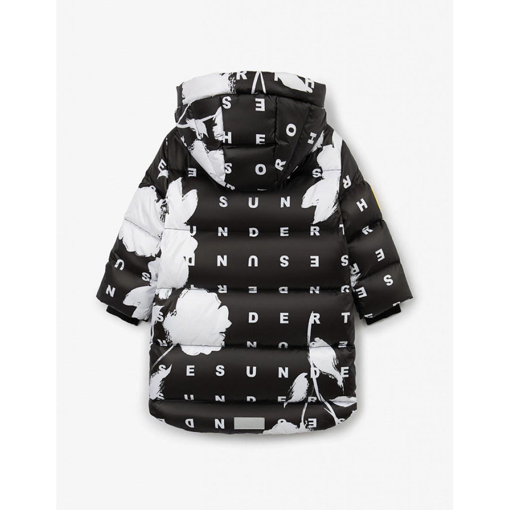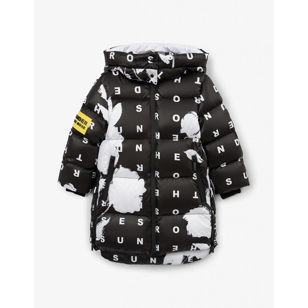 Черное стёганое пальто на натуральном пуху прямой свободной формы с заниженной линией спинки не только обратит на себя внимание, но и согреет, надежно защитив от зимнего холода и ветра. Стильный графичный рисунок выделяет пальто из однотонных аналогов. Ритмичные шрифтовые элементы и крупные флористические мотивы на плащовке, обладающей влагоотталкивающими и ветрозащитными свойствами, выглядят очень свежо, интересно, по-новому. Они придадут прогулочному гардеробу девочки остроту, сделав пальто ярким акцентом зимнего образа. Два вместительных прорезных кармана на литых влагостойких молниях, молнии в боковых швах для комфортного шага, капюшон с внутренними утяжками и рибовые манжеты создают удобство в эксплуатации изделия. Пальто застёгивается на литую влагостойкую молнию с внутренней ветрозащитной планкой. В оформлении модели использована минималистичная шрифтовая нашивка и светоотражающий патч.
