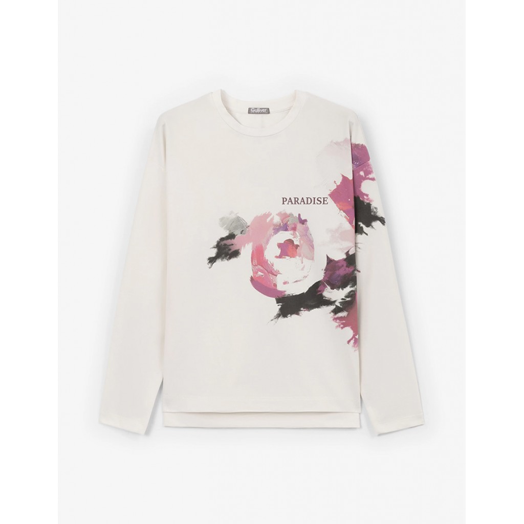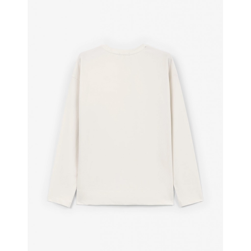 Лонгслив прямой свободной формы со спущенной линией плеч – стильная базовая вещь для свободного времени. Лонгслив с заниженной линией спинки выполнен из мягкого хлопкового полотна, очень приятного при тактильном контакте. Изюминка модели - асимметричный абстрактный принт, переходящий с передней части на рукав, дополненный мелкой шрифтовой графикой.