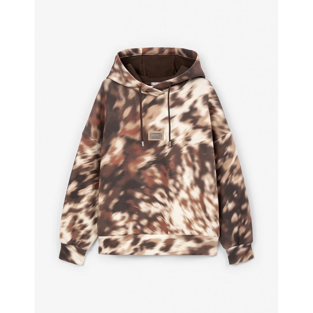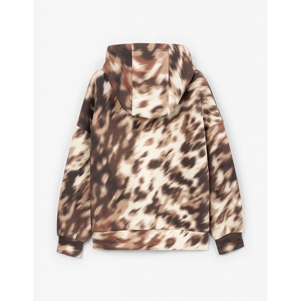 Коричневое худи силуэта умеренный оверсайз со спущенной линией плеч создано для уютных, стильных, небанальных осенних образов девочки. Дизайн модели построен на абстрактном анималистичном рисунке, придающем худи остроту и индивидуальность. Худи выполнено из комфортного смесового трикотажного полотна на основе хлопка, имеющего гладкую, приятную на ощупь поверхность с мягкой петельчатой изнанкой. В оформлении модели использована брендированная металлическая табличка.