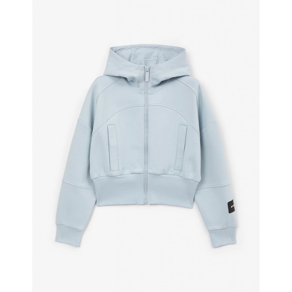 Распашная укороченная толстовка с капюшоном силуэта умеренный оверсайз создана для энергичных, стильных, драйвовых осенних образов девочки. Толстовка, выполненная из мягкого гладкого интерлока на основе хлопка, дарит приятные тактильные ощущения, обладает хорошей пластикой, гигроскопичностью, отлично держит форму. Рельефные акцентные швы создают интересный геометрический рисунок, подчеркивающий динамику спортивного стиля. Толстовка имеет карманы -листочки, завершается широким рибовым поясом и манжетами. На левом рукаве изделия расположена минималистичная нашивка.