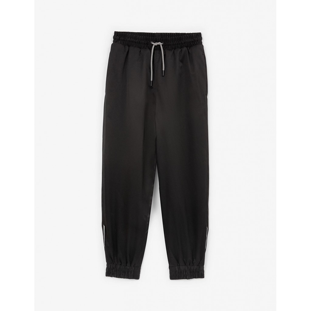 Черные брюки-джоггеры на флисе - важнейший элемент демисезонного гардероба девочки. Брюки выполнены из матовой плащовки, обладающей влагоотталкивающими и ветрозащитными свойствами, что особенно важно в холодный сезон. Эластичный пояс плотно прилегает к талии. Благодаря кордам девочка может самостоятельно отрегулировать его объем. В оформлении модели использован небольшой шрифтовой принт на задней части.