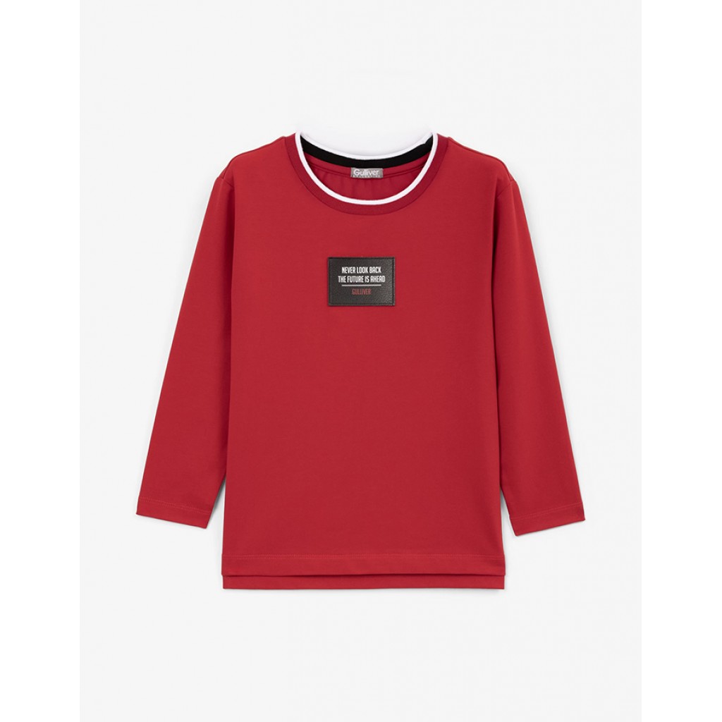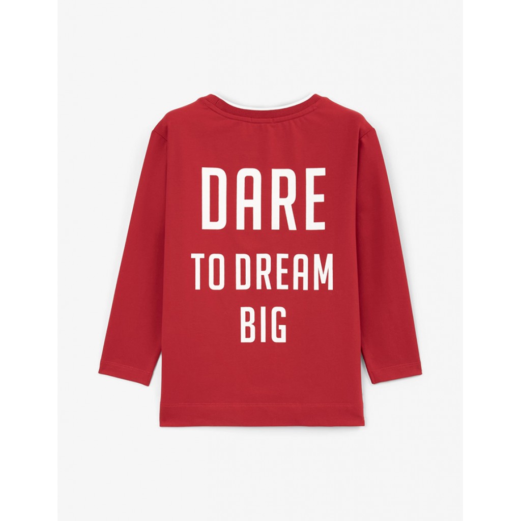 Красный лонгслив прямой свободной формы со спущенной линией плеч – универсальная базовая вещь для осенне-зимнего гардероба мальчика. Лонгслив с заниженной линией спинки выполнен из мягкого хлопкового полотна, очень приятного при тактильном контакте. Дизайн модели построен на крупном шрифтовом принте на спинке и минималистичной кожаной нашивке на передней части лонгслива.